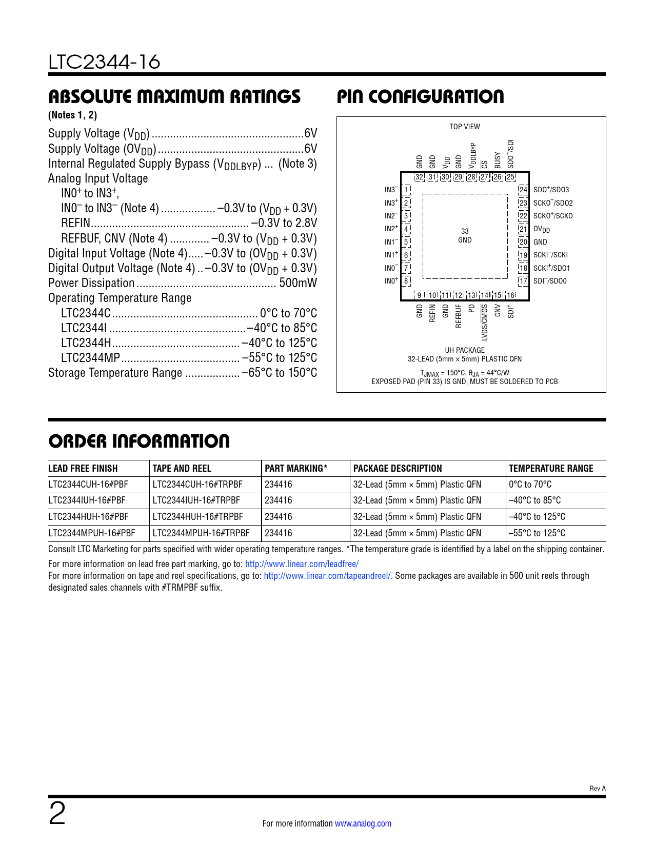 LTC2344-16 ABSOLUTE MAXIMUM RATINGSPIN CONFIGURATION(Notes 1, 2) Supply Voltage (V TOP VIEW DD) ..6V Supply Voltage (OVDD) ..6V – /SDI Internal Regulated Supply Bypass (VDDLBYP) ... (Note 3) GND GND V DD GND V DDLBYP CS BUSY SDO Analog Input Voltage 32 31 30 29 28 27 26 25 IN0+ to IN3+, IN3– 1 24 SDO+/SDO3 IN0– to IN3– (Note 4) .. –0.3V to (V IN3+ 2 23 SCKO–/SDO2 DD + 0.3V) REFIN .. –0.3V to 2.8V IN2– 3 22 SCKO+/SCKO IN2+ 4 21 OV REFBUF, CNV (Note 4) ... –0.3V to (V 33 DD DD + 0.3V) GND IN1– 5 20 GND Digital Input Voltage (Note 4) ... –0.3V to (OVDD + 0.3V) IN1+ 6 19 SCKI–/SCKI Digital Output Voltage (Note 4) .. –0.3V to (OVDD + 0.3V) IN0– 7 18 SCKI+/SDO1 Power Dissipation .. 500mW IN0+ 8 17 SDI–/SDO0 Operating Temperature Range 9 10 11 12 13 14 15 16 LTC2344C .. 0°C to 70°C + PD GND CNV SDI LTC2344I ...–40°C to 85°C REFIN GND CMOS REFBUF LTC2344H .. –40°C to 125°C LVDS/ LTC2344MP ... –55°C to 125°C UH PACKAGE 32-LEAD (5mm × 5mm) PLASTIC QFN Storage Temperature Range .. –65°C to 150°C TJMAX = 150°C, θJA = 44°C/W EXPOSED PAD (PIN 33) IS GND, MUST BE SOLDERED TO PCB ORDER INFORMATION LEAD FREE FINISHTAPE AND REELPART MARKING*PACKAGE DESCRIPTIONTEMPERATURE RANGE LTC2344CUH-16#PBF LTC2344CUH-16#TRPBF 234416 32-Lead (5mm × 5mm) Plastic QFN 0°C to 70°C LTC2344IUH-16#PBF LTC2344IUH-16#TRPBF 234416 32-Lead (5mm × 5mm) Plastic QFN –40°C to 85°C LTC2344HUH-16#PBF LTC2344HUH-16#TRPBF 234416 32-Lead (5mm × 5mm) Plastic QFN –40°C to 125°C LTC2344MPUH-16#PBF LTC2344MPUH-16#TRPBF 234416 32-Lead (5mm × 5mm) Plastic QFN –55°C to 125°C Consult LTC Marketing for parts specified with wider operating temperature ranges. *The temperature grade is identified by a label on the shipping container. For more information on lead free part marking, go to: http://www.linear.com/leadfree/ For more information on tape and reel specifications, go to: http://www.linear.com/tapeandreel/. Some packages are available in 500 unit reels through designated sales channels with #TRMPBF suffix. Rev A 2 For more information www.analog.com Document Outline Features Applications Typical Application Description Absolute Maximum Ratings Order Information Pin Configuration Electrical Characteristics Converter Characteristics Dynamic Accuracy Internal Reference Characteristics Reference Buffer Characteristics Digital Inputs and Digital Outputs Power Requirements ADC Timing Characteristics Typical Performance Characteristics Pin Functions Configuration Tables Functional Block Diagrams Timing Diagram Applications Information Package Description Revision History Typical Application Related Parts