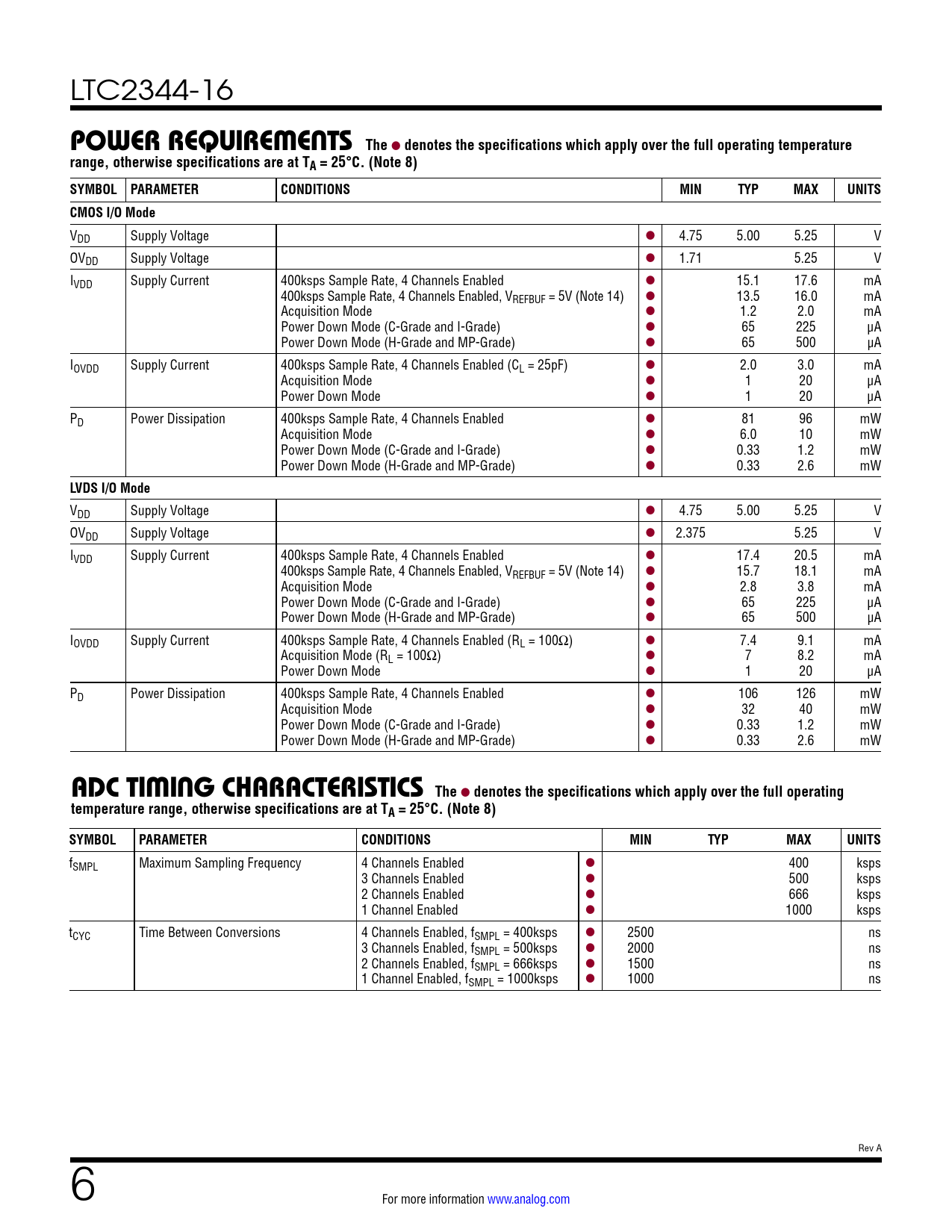 LTC2344-16 POWERREQUIREMENTS The l denotes the specifications which apply over the full operating temperaturerange, otherwise specifications are at TA = 25°C. (Note 8) SYMBOL PARAMETERCONDITIONSMINTYPMAXUNITSCMOS I/O Mode VDD Supply Voltage l 4.75 5.00 5.25 V OVDD Supply Voltage l 1.71 5.25 V IVDD Supply Current 400ksps Sample Rate, 4 Channels Enabled l 15.1 17.6 mA 400ksps Sample Rate, 4 Channels Enabled, VREFBUF = 5V (Note 14) l 13.5 16.0 mA Acquisition Mode l 1.2 2.0 mA Power Down Mode (C-Grade and I-Grade) l 65 225 μA Power Down Mode (H-Grade and MP-Grade) l 65 500 µA IOVDD Supply Current 400ksps Sample Rate, 4 Channels Enabled (CL = 25pF) l 2.0 3.0 mA Acquisition Mode l 1 20 μA Power Down Mode l 1 20 μA PD Power Dissipation 400ksps Sample Rate, 4 Channels Enabled l 81 96 mW Acquisition Mode l 6.0 10 mW Power Down Mode (C-Grade and I-Grade) l 0.33 1.2 mW Power Down Mode (H-Grade and MP-Grade) l 0.33 2.6 mW LVDS I/O Mode VDD Supply Voltage l 4.75 5.00 5.25 V OVDD Supply Voltage l 2.375 5.25 V IVDD Supply Current 400ksps Sample Rate, 4 Channels Enabled l 17.4 20.5 mA 400ksps Sample Rate, 4 Channels Enabled, VREFBUF = 5V (Note 14) l 15.7 18.1 mA Acquisition Mode l 2.8 3.8 mA Power Down Mode (C-Grade and I-Grade) l 65 225 μA Power Down Mode (H-Grade and MP-Grade) l 65 500 µA IOVDD Supply Current 400ksps Sample Rate, 4 Channels Enabled (RL = 100Ω) l 7.4 9.1 mA Acquisition Mode (RL = 100Ω) l 7 8.2 mA Power Down Mode l 1 20 μA PD Power Dissipation 400ksps Sample Rate, 4 Channels Enabled l 106 126 mW Acquisition Mode l 32 40 mW Power Down Mode (C-Grade and I-Grade) l 0.33 1.2 mW Power Down Mode (H-Grade and MP-Grade) l 0.33 2.6 mW ADCTIMING CHARACTERISTICS The l denotes the specifications which apply over the full operatingtemperature range, otherwise specifications are at TA = 25°C. (Note 8)SYMBOLPARAMETERCONDITIONSMINTYPMAXUNITS fSMPL Maximum Sampling Frequency 4 Channels Enabled l 400 ksps 3 Channels Enabled l 500 ksps 2 Channels Enabled l 666 ksps 1 Channel Enabled l 1000 ksps tCYC Time Between Conversions 4 Channels Enabled, fSMPL = 400ksps l 2500 ns 3 Channels Enabled, fSMPL = 500ksps l 2000 ns 2 Channels Enabled, fSMPL = 666ksps l 1500 ns 1 Channel Enabled, fSMPL = 1000ksps l 1000 ns Rev A 6 For more information www.analog.com Document Outline Features Applications Typical Application Description Absolute Maximum Ratings Order Information Pin Configuration Electrical Characteristics Converter Characteristics Dynamic Accuracy Internal Reference Characteristics Reference Buffer Characteristics Digital Inputs and Digital Outputs Power Requirements ADC Timing Characteristics Typical Performance Characteristics Pin Functions Configuration Tables Functional Block Diagrams Timing Diagram Applications Information Package Description Revision History Typical Application Related Parts