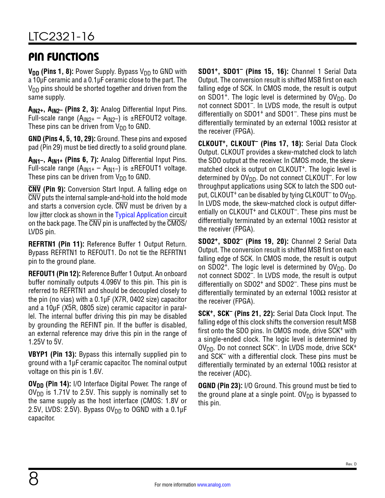 Pages / Page26 / 8 — PIN FUNCTIONS VDD (Pins 1, 8):. SDO1+, SDO1– (Pins 15, 16):. IN2+, AIN2– …
