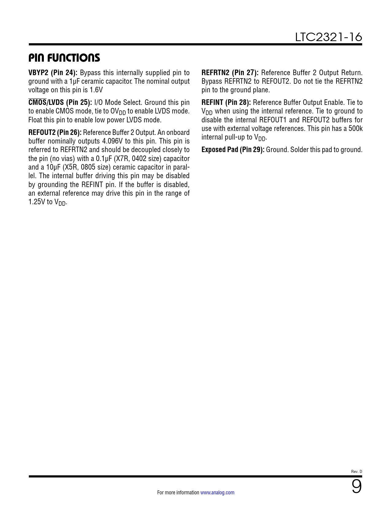 PIN FUNCTIONS VBYP2 (Pin 24):. REFRTN2 (Pin 27):. CMOS/LVDS (Pin 25):. REFINT (Pin 28):. REFOUT2 (Pin 26):. Exposed Pad (Pin 29):