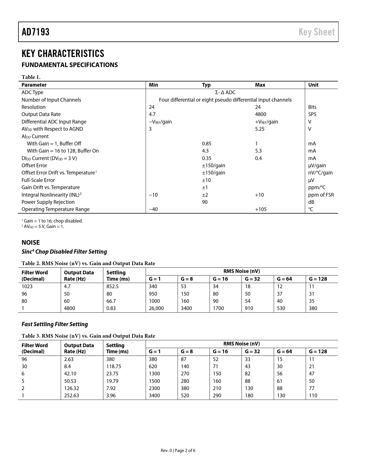 AD7193 Key Sheet KEY CHARACTERISTICS FUNDAMENTAL SPECIFICATIONS Table 1. Parameter Min Typ Max Unit