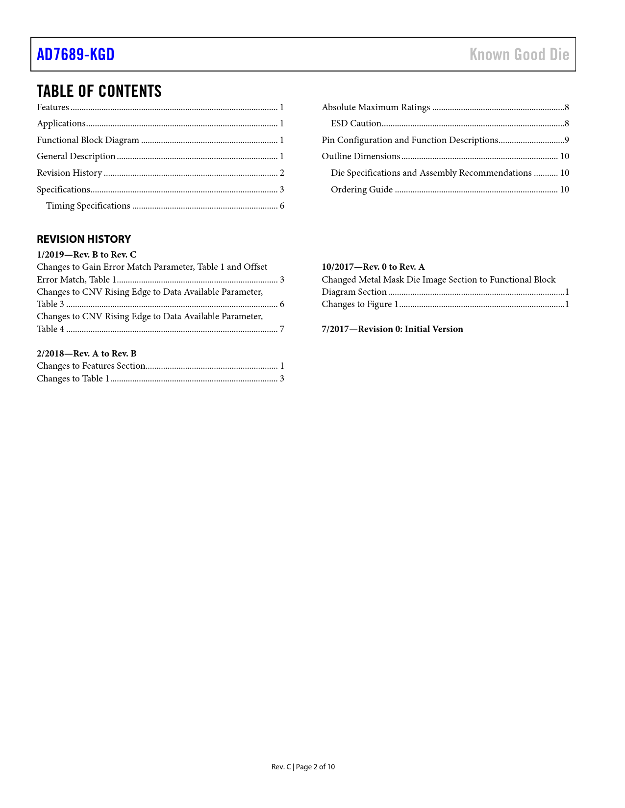 Pages / Page10 / 2 — AD7689-KGD. Known Good Die. TABLE OF CONTENTS. REVISION HISTORY. …