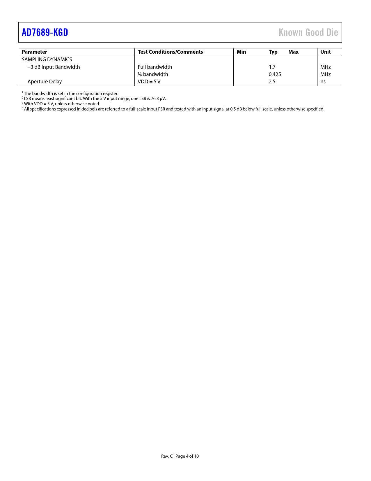 Pages / Page10 / 4 — AD7689-KGD. Known Good Die. Parameter. Test Conditions/Comments. Min. …
