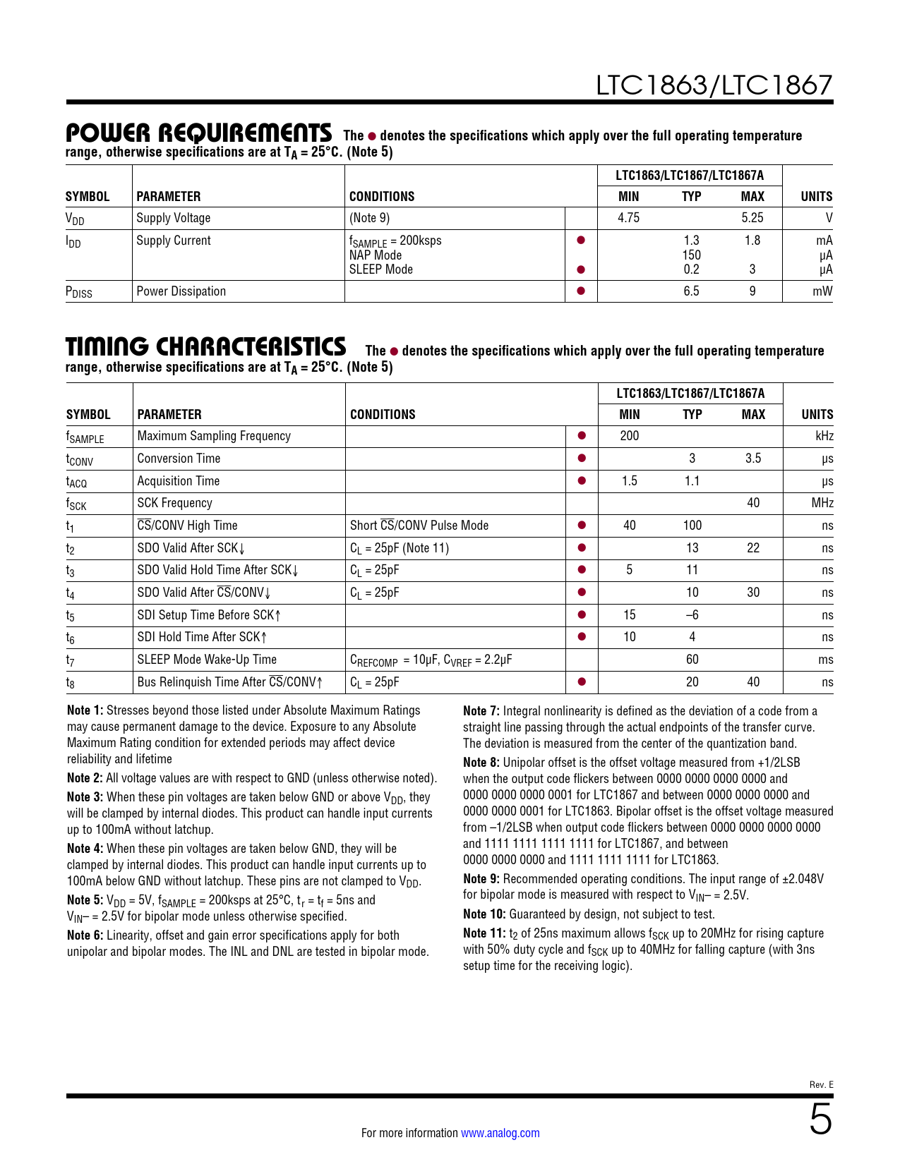 LTC1863/LTC1867 POWER REQUIREMENTS The l denotes the specifications which apply over the full operating temperaturerange, otherwise specifications are at TA = 25°C. (Note 5)LTC1863/LTC1867/LTC1867ASYMBOLPARAMETERCONDITIONSMINTYPMAXUNITS VDD Supply Voltage (Note 9) 4.75 5.25 V IDD Supply Current fSAMPLE = 200ksps l 1.3 1.8 mA NAP Mode 150 µA SLEEP Mode l 0.2 3 µA PDISS Power Dissipation l 6.5 9 mW TIMING CHARACTERISTICS The l denotes the specifications which apply over the full operating temperaturerange, otherwise specifications are at TA = 25°C. (Note 5)LTC1863/LTC1867/LTC1867ASYMBOLPARAMETERCONDITIONSMINTYPMAXUNITS fSAMPLE Maximum Sampling Frequency l 200 kHz tCONV Conversion Time l 3 3.5 µs tACQ Acquisition Time l 1.5 1.1 µs fSCK SCK Frequency 40 MHz t1 CS/CONV High Time Short CS/CONV Pulse Mode l 40 100 ns t2 SDO Valid After SCK↓ CL = 25pF (Note 11) l 13 22 ns t3 SDO Valid Hold Time After SCK↓ CL = 25pF l 5 11 ns t4 SDO Valid After CS/CONV↓ CL = 25pF l 10 30 ns t5 SDI Setup Time Before SCK↑ l 15 –6 ns t6 SDI Hold Time After SCK↑ l 10 4 ns t7 SLEEP Mode Wake-Up Time CREFCOMP = 10µF, CVREF = 2.2µF 60 ms t8 Bus Relinquish Time After CS/CONV↑ CL = 25pF l 20 40 ns Note 1: Stresses beyond those listed under Absolute Maximum Ratings Note 7: Integral nonlinearity is defined as the deviation of a code from a may cause permanent damage to the device. Exposure to any Absolute straight line passing through the actual endpoints of the transfer curve. Maximum Rating condition for extended periods may affect device The deviation is measured from the center of the quantization band. reliability and lifetime Note 8: Unipolar offset is the offset voltage measured from +1/2LSB Note 2: All voltage values are with respect to GND (unless otherwise noted). when the output code flickers between 0000 0000 0000 0000 and Note 3: When these pin voltages are taken below GND or above VDD, they 0000 0000 0000 0001 for LTC1867 and between 0000 0000 0000 and will be clamped by internal diodes. This product can handle input currents 0000 0000 0001 for LTC1863. Bipolar offset is the offset voltage measured up to 100mA without latchup. from –1/2LSB when output code flickers between 0000 0000 0000 0000 Note 4: When these pin voltages are taken below GND, they will be and 1111 1111 1111 1111 for LTC1867, and between clamped by internal diodes. This product can handle input currents up to 0000 0000 0000 and 1111 1111 1111 for LTC1863. 100mA below GND without latchup. These pins are not clamped to VDD. Note 9: Recommended operating conditions. The input range of ±2.048V Note 5: V for bipolar mode is measured with respect to V DD = 5V, fSAMPLE = 200ksps at 25°C, tr = tf = 5ns and IN– = 2.5V. VIN– = 2.5V for bipolar mode unless otherwise specified. Note 10: Guaranteed by design, not subject to test. Note 6: Linearity, offset and gain error specifications apply for both Note 11: t2 of 25ns maximum allows fSCK up to 20MHz for rising capture unipolar and bipolar modes. The INL and DNL are tested in bipolar mode. with 50% duty cycle and fSCK up to 40MHz for falling capture (with 3ns setup time for the receiving logic). Rev. E For more information www.analog.com 5 Document Outline Features Applications Block Diagram Description Absolute Maximum Ratings Order Information Pin Configuration Converter Characteristics Dynamic Accuracy Analog Input Internal Reference Characteristics Digital Inputs and Digital Outputs Power Requirements Timing Characteristics Typical Performance Characteristics Pin Functions Typical Connection Diagram Test Circuits Timing Diagrams Applications Information Package Description Revision History Related Parts