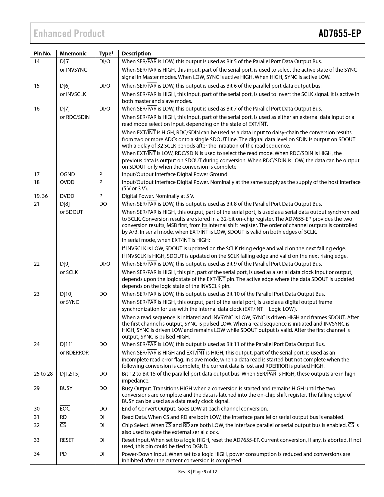 14 D[5] DI/O When SER/PAR is LOW, this output is used as Bit 5 of the Parallel Port Data Output Bus. or INVSYNC When SER/PAR is HIGH, this input, part of the serial port, is used to select the active state of the SYNC signal in Master modes. When LOW, SYNC is active HIGH. When HIGH, SYNC is active LOW. 15 D[6] DI/O When SER/PAR is LOW, this output is used as Bit 6 of the parallel port data output bus. or INVSCLK When SER/PAR is HIGH, this input, part of the serial port, is used to invert the SCLK signal. It is active in both master and slave modes. 16 D[7] DI/O When SER/PAR is LOW, this output is used as Bit 7 of the Parallel Port Data Output Bus. or RDC/SDIN When SER/PAR is HIGH, this input, part of the serial port, is used as either an external data input or a read mode selection input, depending on the state of EXT/INT. When EXT/INT is HIGH, RDC/SDIN can be used as a data input to daisy-chain the conversion results from two or more ADCs onto a single SDOUT line. The digital data level on SDIN is output on SDOUT with a delay of 32 SCLK periods after the initiation of the read sequence. When EXT/INT is LOW, RDC/SDIN is used to select the read mode. When RDC/SDIN is HIGH, the previous data is output on SDOUT during conversion. When RDC/SDIN is LOW, the data can be output on SDOUT only when the conversion is complete. 17 OGND P Input/Output Interface Digital Power Ground. 18 OVDD P Input/Output Interface Digital Power. Nominally at the same supply as the supply of the host interface (5 V or 3 V). 19, 36 DVDD P Digital Power. Nominally at 5 V. 21 D[8] DO When SER/PAR is LOW, this output is used as Bit 8 of the Parallel Port Data Output Bus. or SDOUT When SER/PAR is HIGH, this output, part of the serial port, is used as a serial data output synchronized to SCLK. Conversion results are stored in a 32-bit on-chip register. The AD7655-EP provides the two conversion results, MSB first, from its internal shift register. The order of channel outputs is controlled by A/B. In serial mode, when EXT/INT is LOW, SDOUT is valid on both edges of SCLK. In serial mode, when EXT/INT is HIGH: If INVSCLK is LOW, SDOUT is updated on the SCLK rising edge and valid on the next falling edge. If INVSCLK is HIGH, SDOUT is updated on the SCLK falling edge and valid on the next rising edge. 22 D[9] DI/O When SER/PAR is LOW, this output is used as Bit 9 of the Parallel Port Data Output Bus. or SCLK When SER/PAR is HIGH, this pin, part of the serial port, is used as a serial data clock input or output, depends upon the logic state of the EXT/INT pin. The active edge where the data SDOUT is updated depends on the logic state of the INVSCLK pin. 23 D[10] DO When SER/PAR is LOW, this output is used as Bit 10 of the Parallel Port Data Output Bus. or SYNC When SER/PAR is HIGH, this output, part of the serial port, is used as a digital output frame synchronization for use with the internal data clock (EXT/INT = Logic LOW). When a read sequence is initiated and INVSYNC is LOW, SYNC is driven HIGH and frames SDOUT. After the first channel is output, SYNC is pulsed LOW. When a read sequence is initiated and INVSYNC is HIGH, SYNC is driven LOW and remains LOW while SDOUT output is valid. After the first channel is output, SYNC is pulsed HIGH. 24 D[11] DO When SER/PAR is LOW, this output is used as Bit 11 of the Parallel Port Data Output Bus. or RDERROR When SER/PAR is HIGH and EXT/INT is HIGH, this output, part of the serial port, is used as an incomplete read error flag. In slave mode, when a data read is started but not complete when the following conversion is complete, the current data is lost and RDERROR is pulsed HIGH. 25 to 28 D[12:15] DO Bit 12 to Bit 15 of the parallel port data output bus. When SER/PAR is HIGH, these outputs are in high impedance. 29 BUSY DO Busy Output. Transitions HIGH when a conversion is started and remains HIGH until the two conversions are complete and the data is latched into the on-chip shift register. The falling edge of BUSY can be used as a data ready clock signal. 30 EOC DO End of Convert Output. Goes LOW at each channel conversion. 31 RD DI Read Data. When CS and RD are both LOW, the interface parallel or serial output bus is enabled. 32 CS DI Chip Select. When CS and RD are both LOW, the interface parallel or serial output bus is enabled. CS is also used to gate the external serial clock. 33 RESET DI Reset Input. When set to a logic HIGH, reset the AD7655-EP. Current conversion, if any, is aborted. If not used, this pin could be tied to DGND. 34 PD DI Power-Down Input. When set to a logic HIGH, power consumption is reduced and conversions are inhibited after the current conversion is completed. Rev. B | Page 9 of 12 Document Outline FEATURES APPLICATIONS GENERAL DESCRIPTION FUNCTIONAL BLOCK DIAGRAM PRODUCT HIGHLIGHTS TABLE OF CONTENTS REVISION HISTORY SPECIFICATIONS TIMING SPECIFICATIONS ABSOLUTE MAXIMUM RATINGS ESD CAUTION PIN CONFIGURATIONS AND FUNCTION DESCRIPTIONS OUTLINE DIMENSIONS ORDERING GUIDE