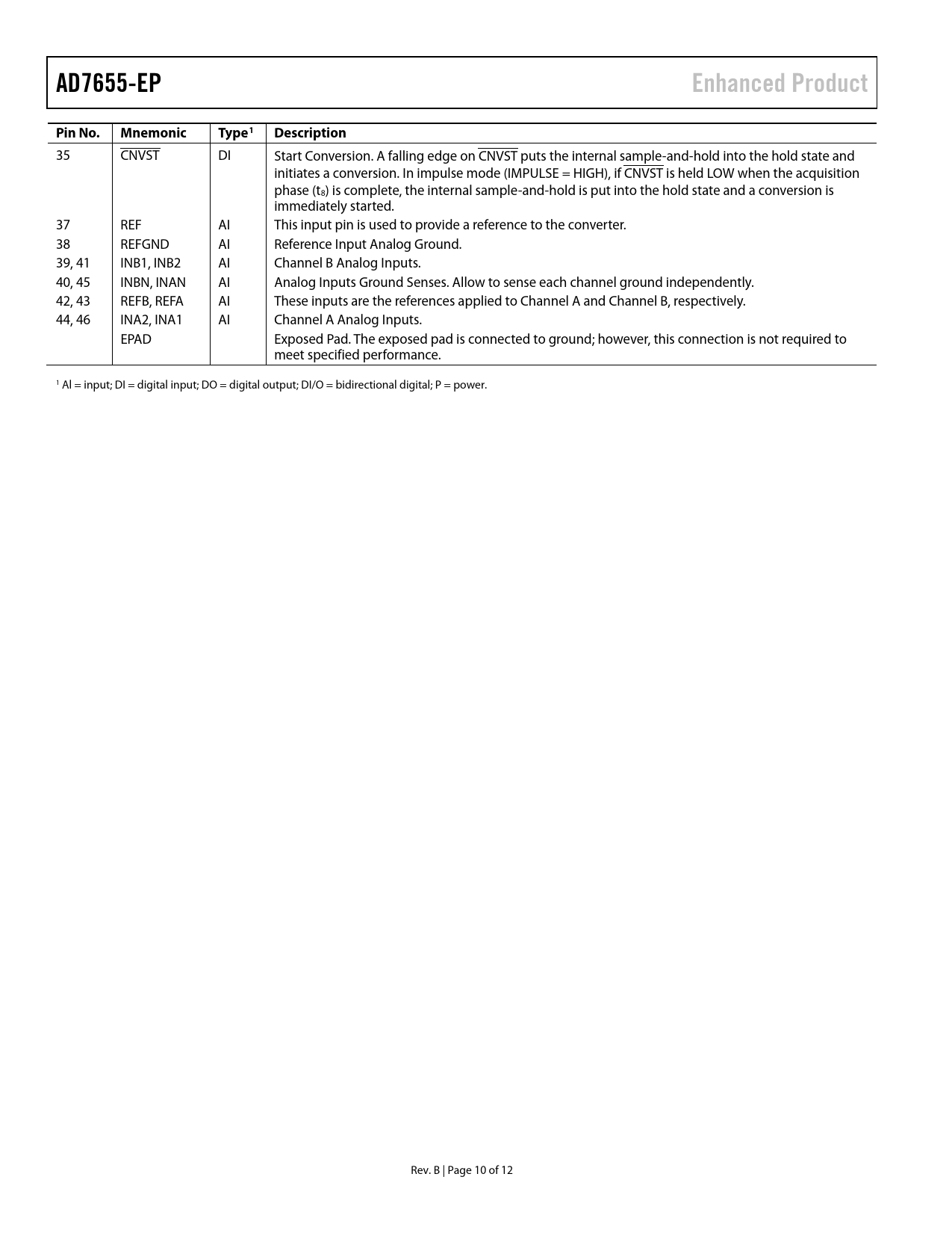 AD7655-EP. Enhanced Product. Pin No. Mnemonic. Type1. Description
