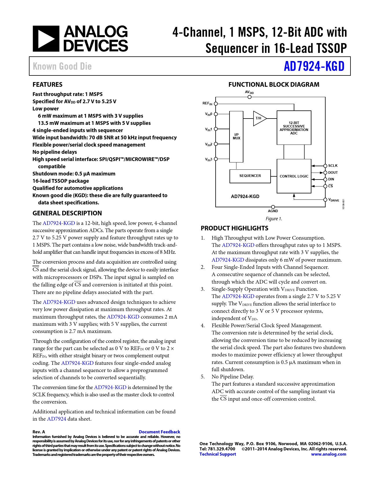 4-Channel, 1 MSPS, 12-Bit ADC with. Sequencer in 16-Lead TSSOP. Known Good Die. AD7924-KGD. FEATURES. FUNCTIONAL BLOCK DIAGRAM