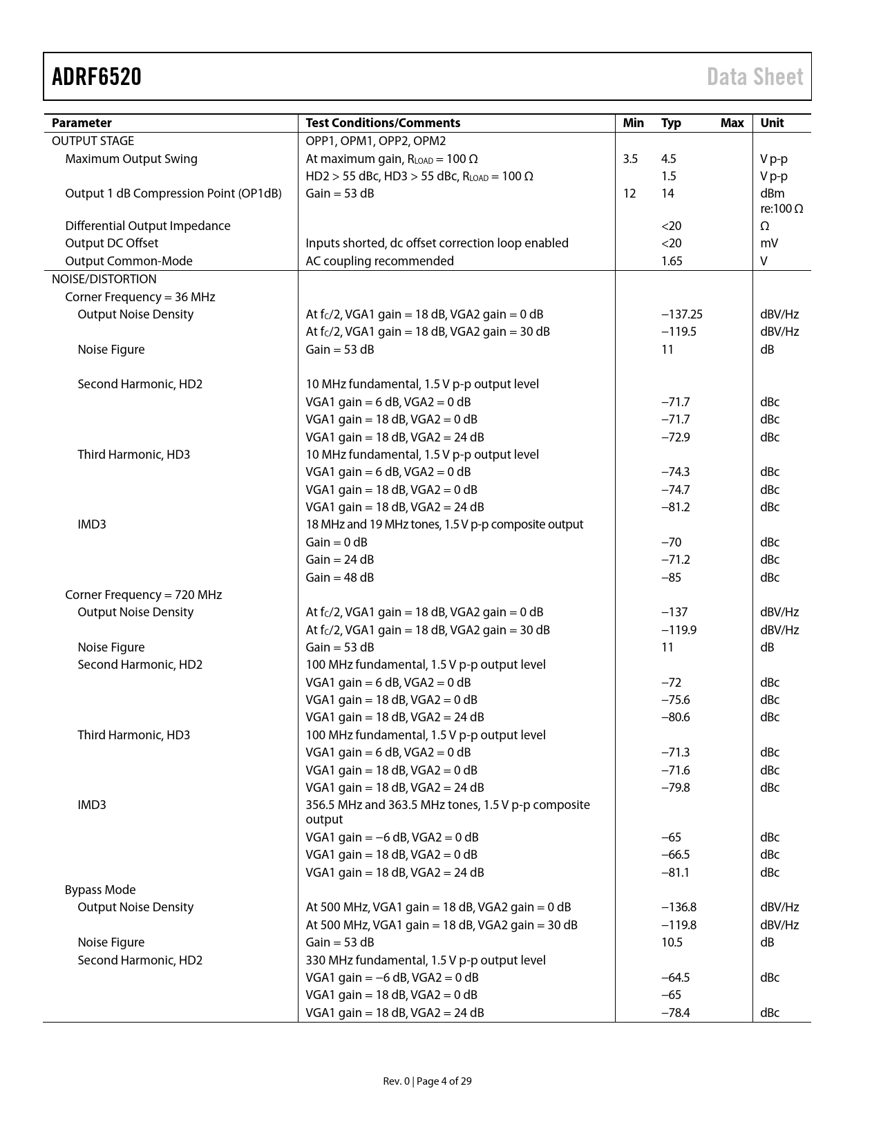 Pages / Page29 / 4 — ADRF6520. Data Sheet. Parameter. Test Conditions/Comments. Min Typ. Max …