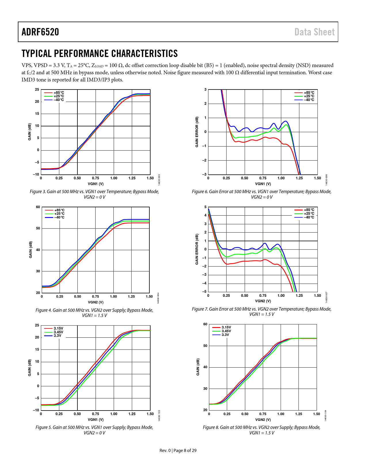 14830- 14830- Figure 4. Gain at 500 MHz vs. VGN2 over Supply; Bypass Mode, Figure 7. Gain Error at 500 MHz vs. VGN2 over Temperature; Bypass Mode, VGN1 = 1.5 V VGN1 = 1.5 V