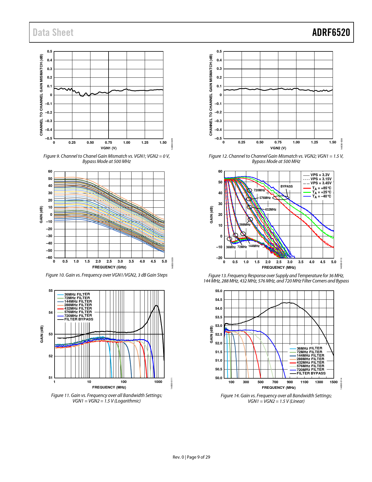 Data SheetADRF65200.50.5B)B)d0.4d0.4CH (CH (0.30.3ATATMMIS0.2IS0.2N MN M0.10.1AIAIGGL0L0–0.1–0.1CHANNE –0.2CHANNEO–0.2OTTLL–0.3–0.3–0.4–0.4CHANNECHANNE–0.5–0.500.250.500.751.001.251.50 005 00.250.500.751.001.251.50 008 VGN1 (V) 14830- VGN2 (V) 14830- Figure 9. Channel to Chanel Gain Mismatch vs. VGN1; VGN2 = 0 V, Figure 12. Channel to Channel Gain Mismatch vs. VGN2; VGN1 = 1.5 V, Bypass Mode at 500 MHz Bypass Mode at 500 MHz 6060VPS = 3.3V50VPS = 3.15V50VPS = 3.45V40BYPASST720MHzA = +85°C3040TA = +25°CT576MHzA = –40°C203010B)B)dd432MHz0N (20N (AIAIG–10G10288MHz–20–300–40–10144MHz36MHz 72MHz–50–60–2000.51.01.52.02.53.03.54.04.55.0 009 00.51.01.52.02.53.03.54.04.55.0 013 FREQUENCY (GHz) 14830- FREQUENCY (MHz) 14830- Figure 10. Gain vs. Frequency over VGN1/VGN2, 3 dB Gain Steps Figure 13. Frequency Response over Supply and Temperature for 36 MHz, 144 MHz, 288 MHz, 432 MHz, 576 MHz, and 720 MHz Filter Corners and Bypass 5555.036MHz FILTER 72MHz FILTER54.5144MHz FILTER 288MHz FILTER 432MHz FILTER54.054576MHz FILTER 720MHz FILTER53.5FILTER BYPASS53.0B)B)dd53N (52.5N (AIAIGG 52.036MHz FILTER51.572MHz FILTER52144MHz FILTER51.0288MHz FILTER 432MHz FILTER 576MHz FILTER50.5720MHz FILTER FILTER BYPASS5150.01101001000 011 100300500700900110013001500 014 FREQUENCY (MHz) 14830- FREQUENCY (MHz) 14830- Figure 11. Gain vs. Frequency over all Bandwidth Settings; Figure 14. Gain vs. Frequency over all Bandwidth Settings; VGN1 = VGN2 = 1.5 V (Logarithmic) VGN1 = VGN2 = 1.5 V (Linear) Rev. 0 | Page 9 of 29 Document Outline FEATURES APPLICATIONS FUNCTIONAL BLOCK DIAGRAM GENERAL DESCRIPTION TABLE OF CONTENTS REVISION HISTORY SPECIFICATIONS ABSOLUTE MAXIMUM RATINGS THERMAL RESISTANCE ESD CAUTION PIN CONFIGURATION AND FUNCTION DESCRIPTIONS TYPICAL PERFORMANCE CHARACTERISTICS THEORY OF OPERATION INPUT VGAs RMS DETECTOR PROGRAMMABLE FILTERS Bypassing the Filters VARIABLE GAIN AMPLIFIERS OUTPUT BUFFERS/ADC DRIVERS DC OFFSET COMPENSATION LOOP PROGRAMMING THE ADRF6520 NOISE CHARACTERISTICS DISTORTION CHARACTERISTICS MAXIMIZING THE DYNAMIC RANGE KEY PARAMETERS FOR QUADRATURE-BASED RECEIVERS SPI REGISTER AND TIMING REGISTER READ/WRITE TIMING Write Cycle Read Cycle APPLICATIONS INFORMATION BASIC CONNECTIONS SUPPLY DECOUPLING INPUT SIGNAL PATH OUTPUT SIGNAL PATH DC OFFSET COMPENSATION LOOP ENABLED SERIAL PORT CONNECTIONS ENABLE/DISABLE FUNCTION GAIN PIN DECOUPLING RMS DETECTOR CONNECTIONS VGA2 GAIN STEP RESPONSE LINEAR OPERATION OF THE ADRF6520 EVALUATION BOARD OUTLINE DIMENSIONS ORDERING GUIDE