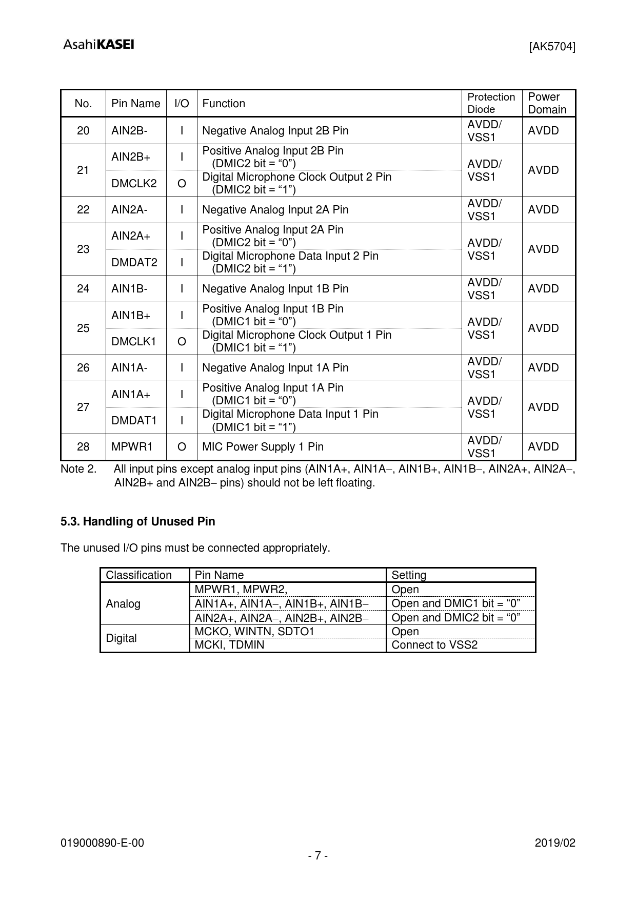 [AK5704] Protection Power No. Pin Name I/O Function Diode Domain AVDD/ 20 AIN2B- I Negative Analog Input 2B Pin AVDD VSS1 Positive Analog Input 2B Pin AIN2B+ I (DMIC2 bit = “0”) AVDD/ 21 AVDD Digital Microphone Clock Output 2 Pin VSS1 DMCLK2 O (DMIC2 bit = “1”) AVDD/ 22 AIN2A- I Negative Analog Input 2A Pin AVDD VSS1 Positive Analog Input 2A Pin AIN2A+ I (DMIC2 bit = “0”) AVDD/ 23 AVDD Digital Microphone Data Input 2 Pin VSS1 DMDAT2 I (DMIC2 bit = “1”) AVDD/ 24 AIN1B- I Negative Analog Input 1B Pin AVDD VSS1 Positive Analog Input 1B Pin AIN1B+ I (DMIC1 bit = “0”) AVDD/ 25 AVDD Digital Microphone Clock Output 1 Pin VSS1 DMCLK1 O (DMIC1 bit = “1”) AVDD/ 26 AIN1A- I Negative Analog Input 1A Pin AVDD VSS1 Positive Analog Input 1A Pin AIN1A+ I (DMIC1 bit = “0”) AVDD/ 27 AVDD Digital Microphone Data Input 1 Pin VSS1 DMDAT1 I (DMIC1 bit = “1”) AVDD/ 28 MPWR1 O MIC Power Supply 1 Pin AVDD VSS1 Note 2. All input pins except analog input pins (AIN1A+, AIN1A, AIN1B+, AIN1B, AIN2A+, AIN2A, AIN2B+ and AIN2B pins) should not be left floating.