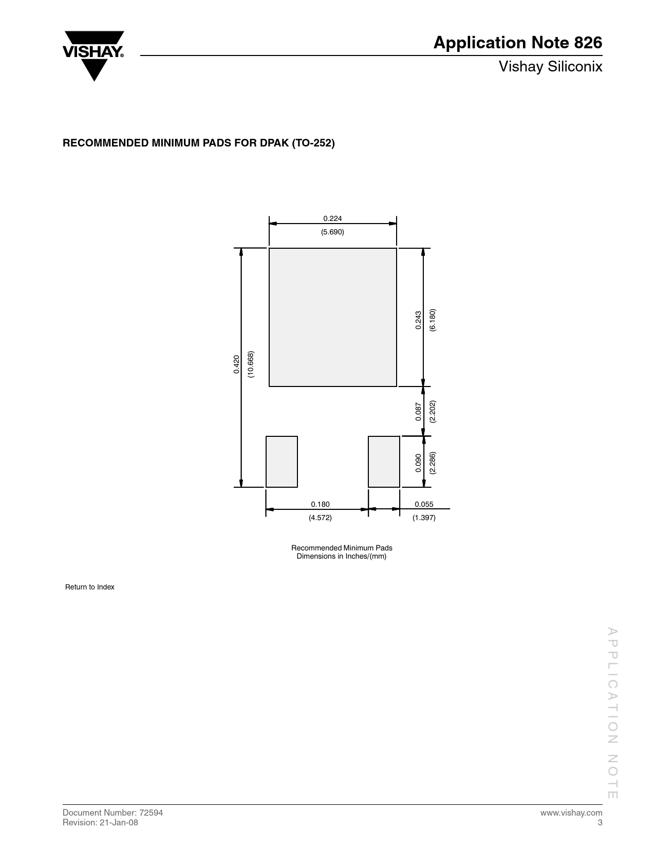 0.224 (5.690) 0.243 (6.180) 0.420 (10.668) 0.087 (2.202) 0.090 (2.286) 0.180 0.055 (4.572) (1.397) Recommended Minimum Pads Dimensions in Inches/(mm) Return to Index Return to Index APPLICATION NOTE Document Number: 72594 www.vishay.com Revision: 21-Jan-08 3