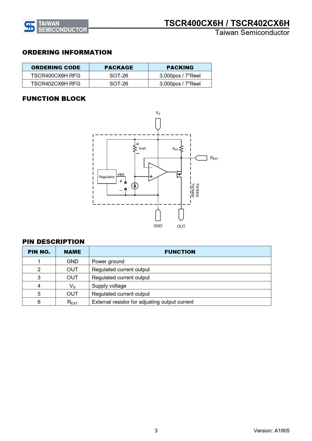 TSCR400CX6H / TSCR402CX6H. ORDERING INFORMATION. ORDERING CODE. PACKAGE. PACKING. FUNCTION BLOCK. PIN DESCRIPTION. PIN NO. NAME. FUNCTION