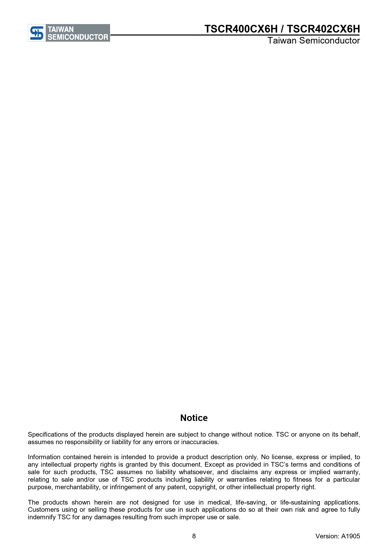 TSCR400CX6H / TSCR402CX6H Taiwan Semiconductor Notice Specifications of the products displayed herein are subject to change without notice. TSC or anyone on its behalf, assumes no responsibility or liability for any errors or inaccuracies. Information contained herein is intended to provide a product description only. No license, express or implied, to any intel ectual property rights is granted by this document. Except as provided in TSC’s terms and conditions of sale for such products, TSC assumes no liability whatsoever, and disclaims any express or implied warranty, relating to sale and/or use of TSC products including liability or warranties relating to fitness for a particular purpose, merchantability, or infringement of any patent, copyright, or other intellectual property right. The products shown herein are not designed for use in medical, life-saving, or life-sustaining applications. Customers using or selling these products for use in such applications do so at their own risk and agree to ful y indemnify TSC for any damages resulting from such improper use or sale. 8 Version: A1905