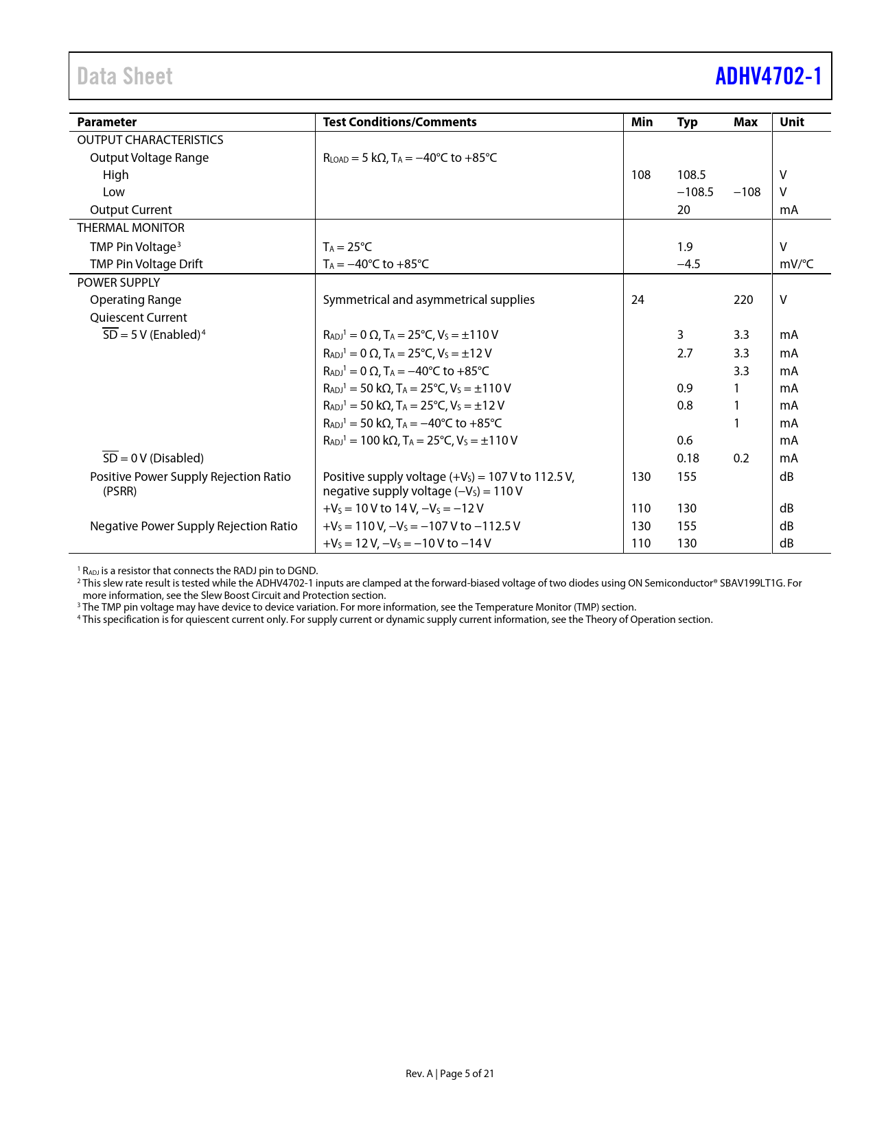 Pages / Page21 / 5 — Data Sheet. ADHV4702-1. Parameter. Test Conditions/Comments. Min. Typ. …