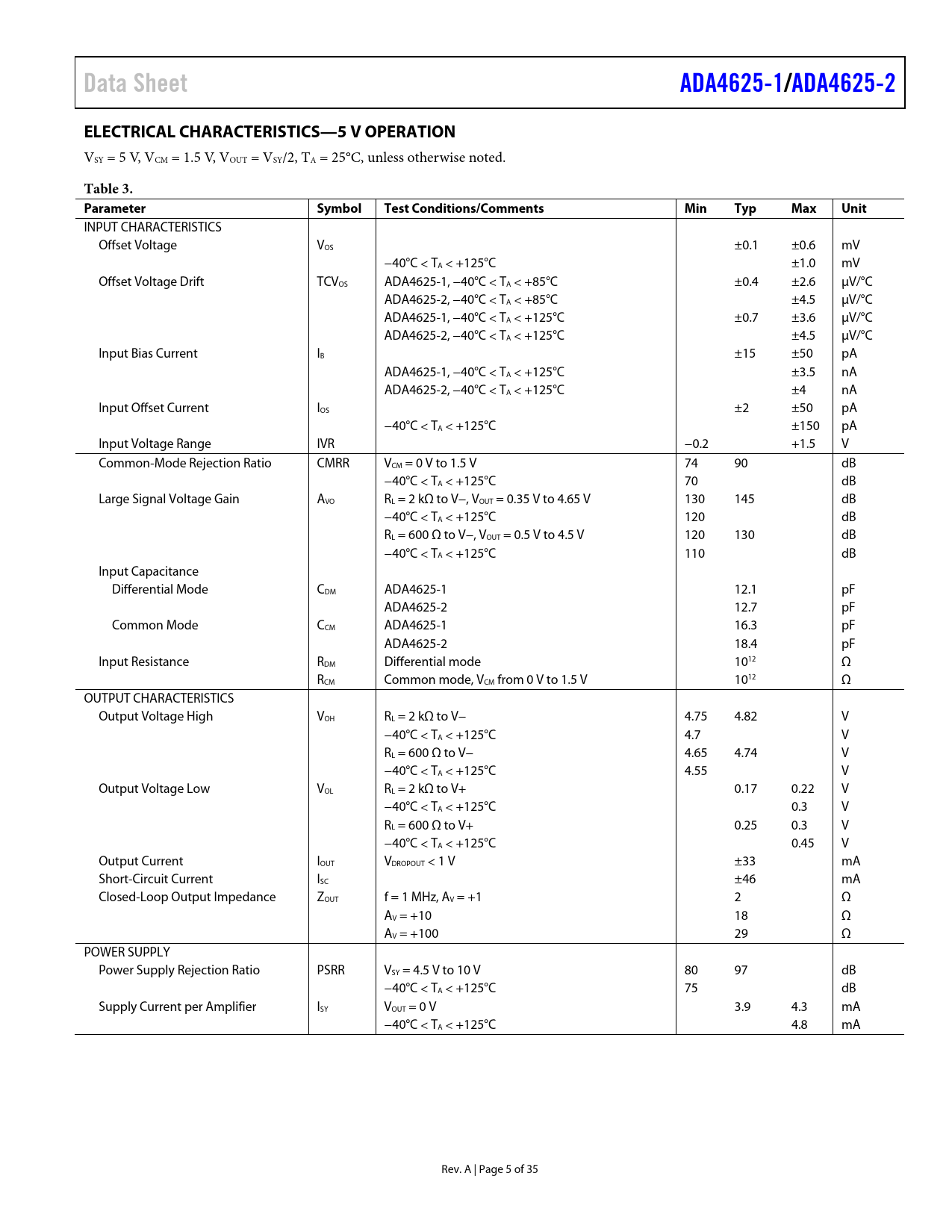 Data Sheet. ADA4625-1/. ADA4625-2. ELECTRICAL CHARACTERISTICS—5 V OPERATION. Table 3. Parameter. Symbol. Test Conditions/Comments