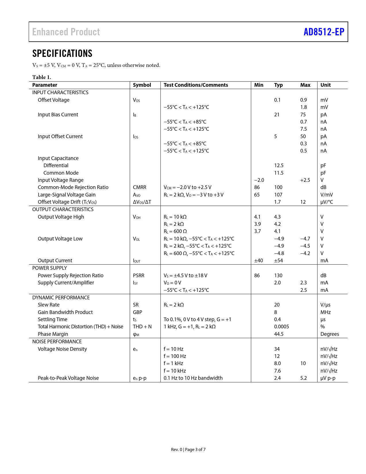 Pages / Page7 / 3 — Enhanced Product. AD8512-EP. SPECIFICATIONS. Table 1. Parameter. Symbol. …