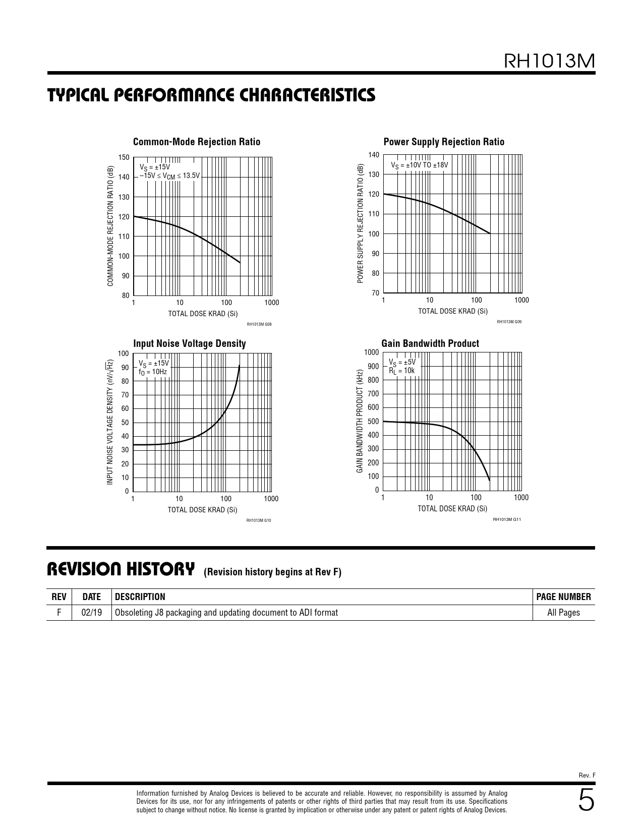 RH1013M TYPICAL PERFORMANCE CHARACTERISTICSCommon-Mode Rejection RatioPower Supply Rejection Ratio 150 140 V V S = ±15V S = ±10V TO ±18V 140 –15V ≤ VCM ≤ 13.5V 130 130 120 120 110 110 100 100 90 90 80 COMMON-MODE REJECTION RATIO (dB) POWER SUPPLY REJECTION RATIO (dB) 80 70 1 10 100 1000 1 10 100 1000 TOTAL DOSE KRAD (Si) TOTAL DOSE KRAD (Si) RH1013M G09 RH1013M G08 Input Noise Voltage DensityGain Bandwidth Product 100 1000 90 VS = ±15V 900 VS = ±5V f R O = 10Hz L = 10k 80 800 70 700 60 600 50 500 40 400 30 300 20 200 GAIN BANDWIDTH PRODUCT (kHz) 10 100 INPUT NOISE VOLTAGE DENSITY (nV/√Hz) 0 0 1 10 100 1000 1 10 100 1000 TOTAL DOSE KRAD (Si) TOTAL DOSE KRAD (Si) RH1013M G10 RH1013M G11 REVISION HISTORY (Revision history begins at Rev F)REVDATEDESCRIPTIONPAGE NUMBER F 02/19 Obsoleting J8 packaging and updating document to ADI format All Pages Rev. F Information furnished by Analog Devices is believed to be accurate and reliable. However, no responsibility is assumed by Analog Devices for its use, nor for any infringements of patents or other rights of third parties that may result from its use. Specifications For more information www.a subject to change without notice. No license is granted by implication or other nalog.com wise under any patent or patent rights of Analog Devices. 5 Document Outline Description Burn-In Circuit Package/Order Information Absolute Maximum Ratings Total Dose Bias Circuit Table 1: Electrical characteristics Table 1a: Electrical characteristics Table 2: Electrical Test Requirements Typical Performance Characteristics Revision History Rad Hard