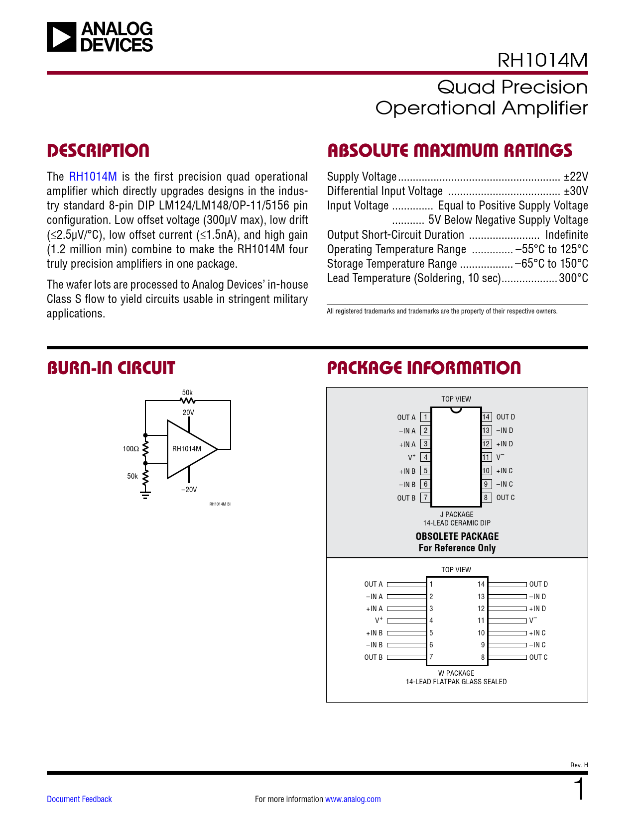 The RH1014M is the first precision quad operational Supply Voltage ... ±22V amplifier which directly upgrades designs in the indus- Differential Input Voltage .. ±30V try standard 8-pin DIP LM124/LM148/OP-11/5156 pin Input Voltage .. Equal to Positive Supply Voltage configuration. Low offset voltage (300µV max), low drift ... 5V Below Negative Supply Voltage (≤2.5µV/°C), low offset current (≤1.5nA), and high gain Output Short-Circuit Duration .. Indefinite (1.2 million min) combine to make the RH1014M four Operating Temperature Range .. –55°C to 125°C truly precision amplifiers in one package. Storage Temperature Range .. –65°C to 150°C The wafer lots are processed to Analog Devices’ in-house Lead Temperature (Soldering, 10 sec) ...300°C Class S flow to yield circuits usable in stringent military applications. All registered trademarks and trademarks are the property of their respective owners.