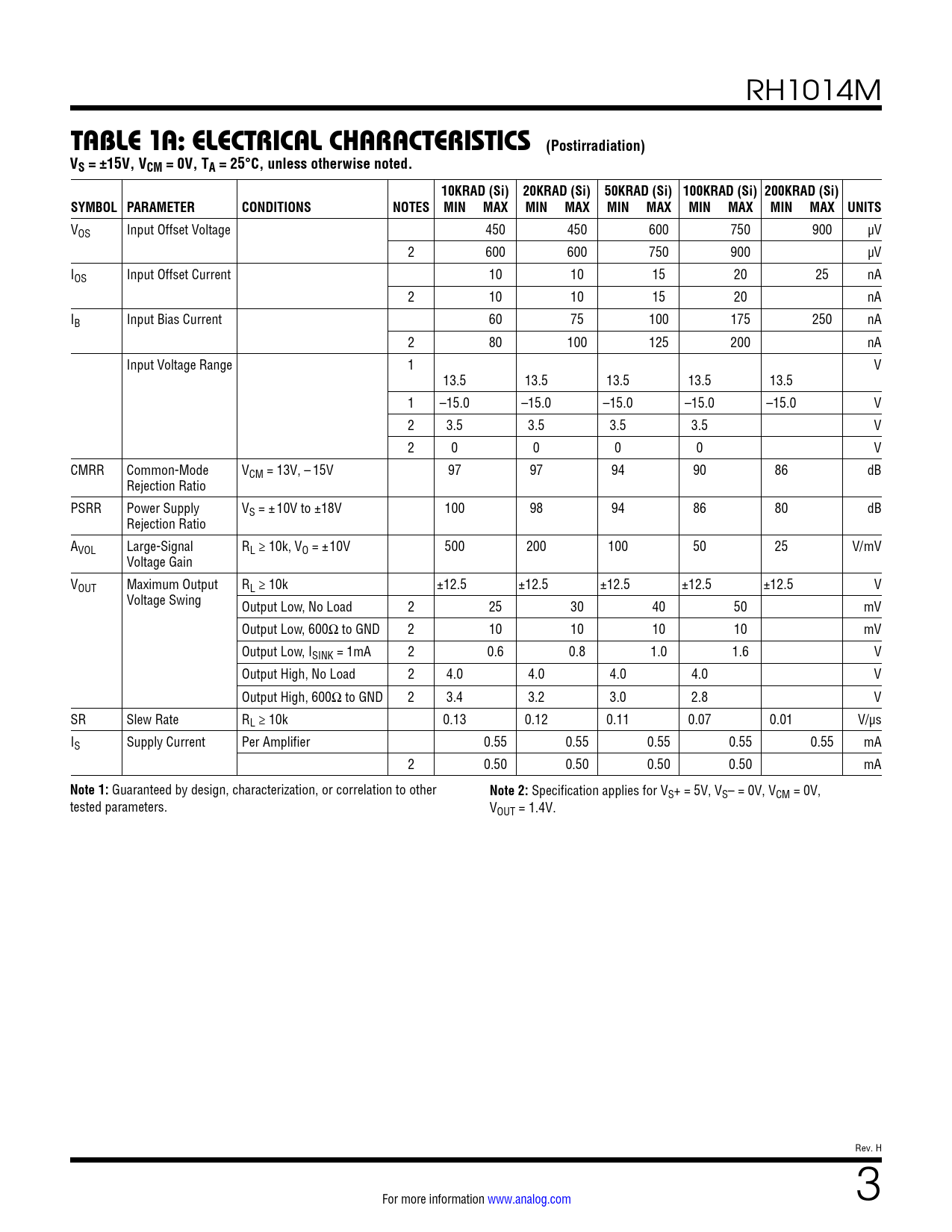 TABLE 1A: ELECTRICAL CHARACTERISTICS (Postirradiation) VS = ±15V, VCM = 0V, TA = 25°C, unless otherwise noted. 10KRAD (Si) 20KRAD (Si) 50KRAD (Si) 100KRAD (Si) 200KRAD (Si) SYMBOL PARAMETER CONDITIONS NOTES MIN MAX MIN MAX MIN MAX MIN MAX MIN MAX UNITS