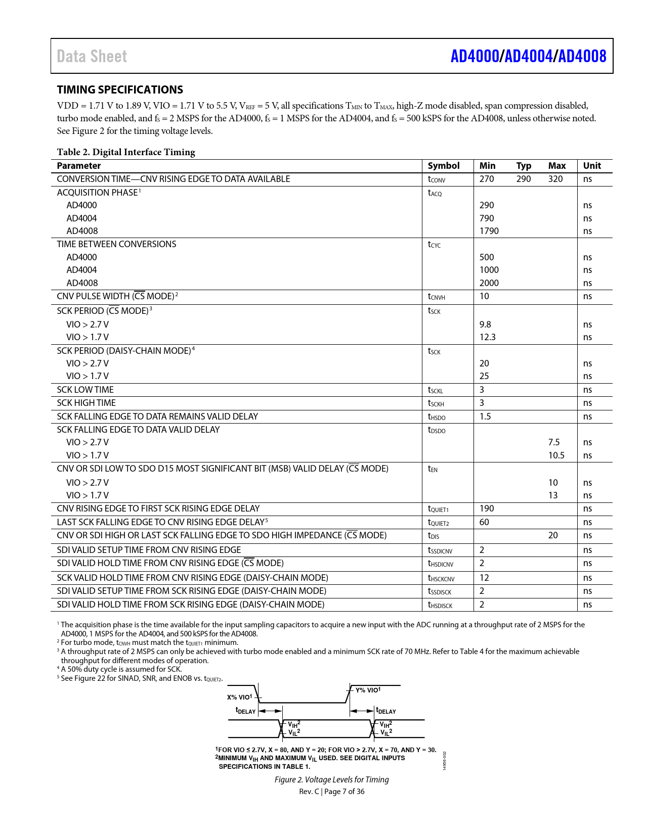 Pages / Page36 / 7 — Data Sheet. AD4000/. AD4004/. AD4008. TIMING SPECIFICATIONS. Table 2. …