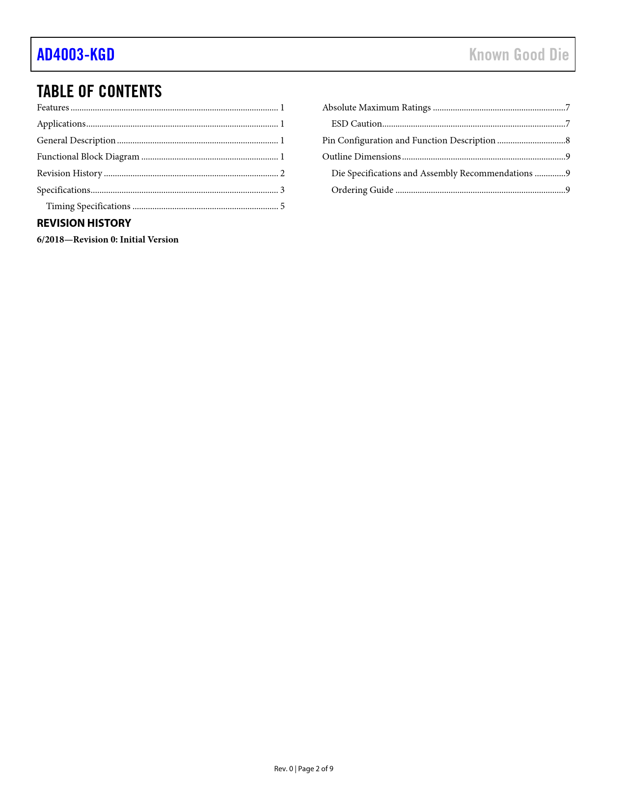 link to page 1 link to page 1 link to page 1 link to page 1 link to page 2 link to page 3 link to page 5 link to page 7 link to page 8 link to page 9 link to page 9 link to page 7 link to page 9 AD4003-KGDKnown Good DieTABLE OF CONTENTS Features .. 1 Absolute Maximum Ratings ..7 Applications ... 1 ESD Caution...7 General Description ... 1 Pin Configuration and Function Description ...8 Functional Block Diagram .. 1 Outline Dimensions ..9 Revision History ... 2 Die Specifications and Assembly Recommendations ..9 Specifications ... 3 Ordering Guide ...9 Timing Specifications .. 5 REVISION HISTORY6/2018—Revision 0: Initial Version Rev. 0 | Page 2 of 9 Document Outline Features Applications General Description Functional Block Diagram Revision History Specifications Timing Specifications Absolute Maximum Ratings ESD Caution Pin Configuration and Function Description Outline Dimensions Die Specifications and Assembly Recommendations Ordering Guide
