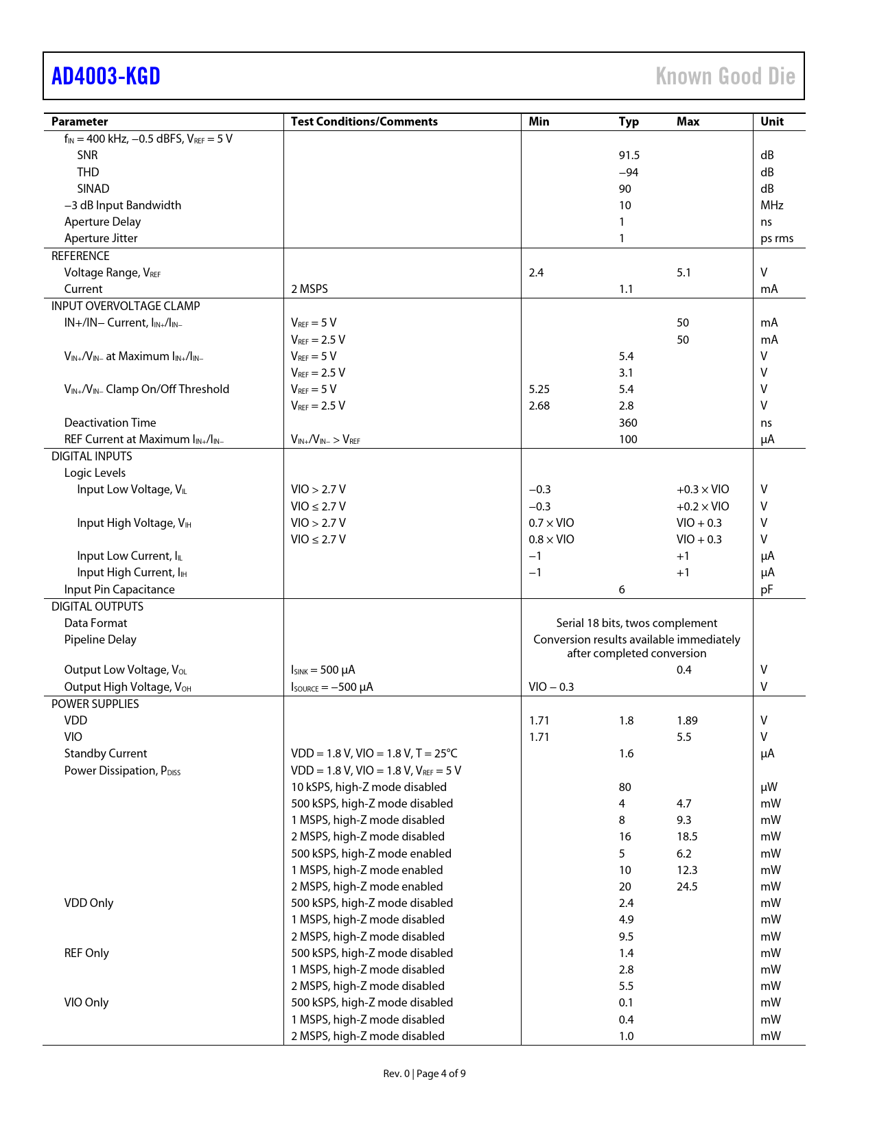 | Pages / Page | 9 / 4 — AD4003-KGD. Known Good Die. Parameter. Test Conditions/Comments. Min. … |