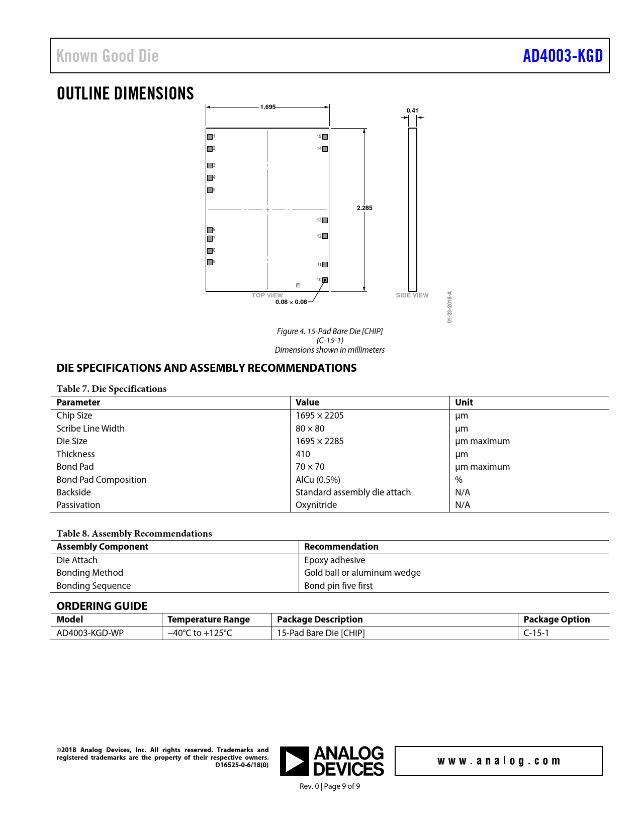 AD4003-KGD-WP −40°C to +125°C 15-Pad Bare Die [CHIP] C-15-1