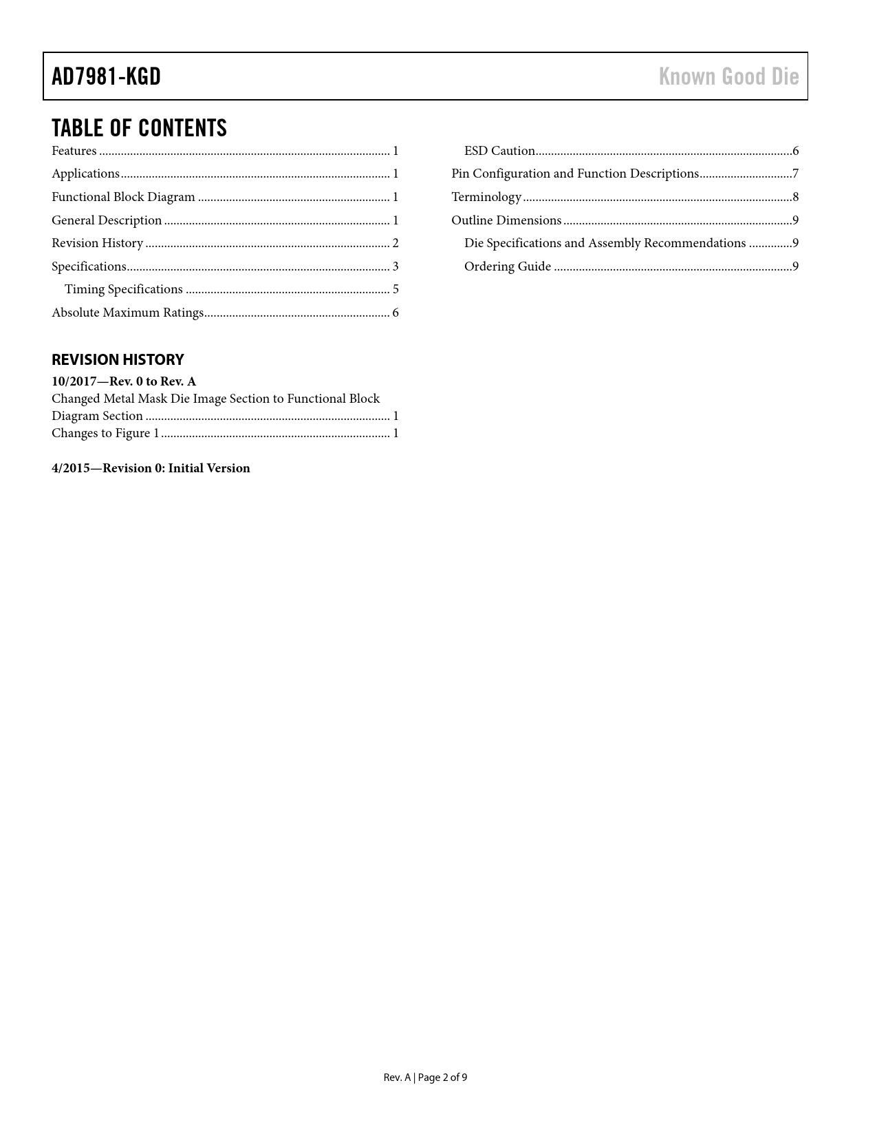 Pages / Page9 / 2 — AD7981-KGD. Known Good Die. TABLE OF CONTENTS. REVISION HISTORY …