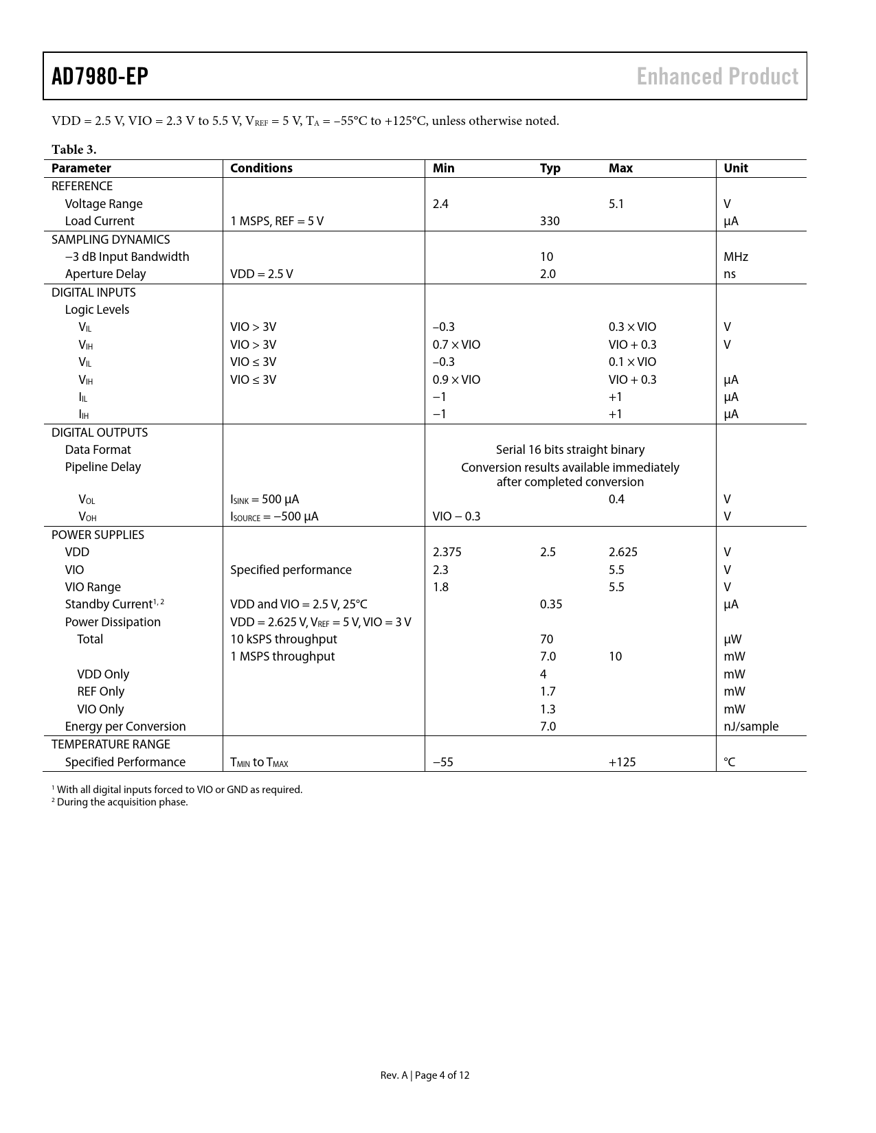 Pages / Page12 / 4 — AD7980-EP. Enhanced Product. Table 3. Parameter. Conditions. Min. Typ. …