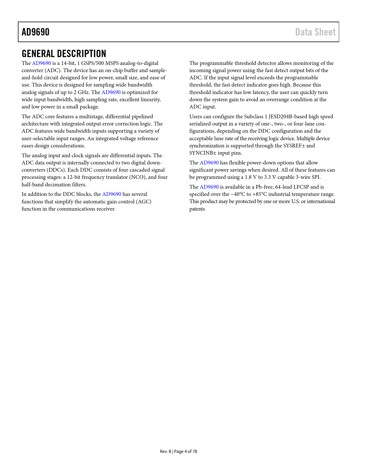 AD9690Data SheetGENERAL DESCRIPTION The AD9690 is a 14-bit, 1 GSPS/500 MSPS analog-to-digital The programmable threshold detector allows monitoring of the converter (ADC). The device has an on-chip buffer and sample- incoming signal power using the fast detect output bits of the and-hold circuit designed for low power, small size, and ease of ADC. If the input signal level exceeds the programmable use. This device is designed for sampling wide bandwidth threshold, the fast detect indicator goes high. Because this analog signals of up to 2 GHz. The AD9690 is optimized for threshold indicator has low latency, the user can quickly turn wide input bandwidth, high sampling rate, excel ent linearity, down the system gain to avoid an overrange condition at the and low power in a small package. ADC input. The ADC core features a multistage, differential pipelined Users can configure the Subclass 1 JESD204B-based high speed architecture with integrated output error correction logic. The serialized output in a variety of one-, two-, or four-lane con- ADC features wide bandwidth inputs supporting a variety of figurations, depending on the DDC configuration and the user-selectable input ranges. An integrated voltage reference acceptable lane rate of the receiving logic device. Multiple device eases design considerations. synchronization is supported through the SYSREF± and The analog input and clock signals are differential inputs. The SYNCINB± input pins. ADC data output is internally connected to two digital down- The AD9690 has flexible power-down options that al ow converters (DDCs). Each DDC consists of four cascaded signal significant power savings when desired. All of these features can processing stages: a 12-bit frequency translator (NCO), and four be programmed using a 1.8 V to 3.3 V capable 3-wire SPI. half-band decimation filters. The AD9690 is available in a Pb-free, 64-lead LFCSP and is In addition to the DDC blocks, the AD9690 has several specified over the −40°C to +85°C industrial temperature range. functions that simplify the automatic gain control (AGC) This product may be protected by one or more U.S. or international function in the communications receiver. patents Rev. B | Page 4 of 78 Document Outline Features Applications Functional Block Diagram Product Highlights Revision History General Description Specifications DC Specifications AC Specifications Digital Specifications Switching Specifications Timing Specifications Timing Diagrams Absolute Maximum Ratings Thermal Characteristics ESD Caution Pin Configuration and Function Descriptions Typical Performance Characteristics AD9690-1000 AD9690-500 Equivalent Circuits Theory of Operation ADC Architecture Analog Input Considerations Differential Input Configurations Input Common Mode Analog Input Buffer Controls and SFDR Optimization Input Buffer Control Registers (0x018, 0x019, 0x01A, 0x935, 0x934, 0x11A) Absolute Maximum Input Swing Voltage Reference Clock Input Considerations Clock Duty Cycle Considerations Input Clock Divider Input Clock Divider ½ Period Delay Adjust Clock Fine Delay Adjust Clock Jitter Considerations Power-Down/Standby Mode Temperature Diode ADC Overrange and Fast Detect ADC Overrange Fast Threshold Detection (FD) Signal Monitor SPORT Over JESD204B Digital Downconverter (DDC) DDC I/Q Input Selection DDC I/Q Output Selection DDC General Description Frequency Translation General Description Variable IF Mode 0 Hz IF (ZIF) Mode fS/4 Hz IF Mode Test Mode DDC NCO Plus Mixer Loss and SFDR Numerically Controlled Oscillator Setting Up the NCO FTW and POW NCO Synchronization Mixer FIR Filters General Description Half-Band Filters HB4 Filter HB3 Filter HB2 Filter HB1 Filter DDC Gain Stage DDC Complex—Real Conversion DDC Example Configurations Digital Outputs Introduction to the JESD204B Interface JESD204B Overview Functional Overview Transport Layer Data Link Layer Physical Layer JESD204B Link Establishment Code Group Synchronization (CGS) and SYNCINB± Initial Lane Alignment Sequence (ILAS) User Data and Error Detection 8-Bit/10-Bit Encoder Physical Layer (Driver) Outputs Digital Outputs, Timing, and Controls De-Emphasis Phase-Locked Loop JESD204B Tx Converter Mapping Configuring the JESD204B Link Multichip Synchronization SYSREF± Setup/Hold Window Monitor Test Modes ADC Test Modes JESD204B Block Test Modes Transport Layer Sample Test Mode Interface Test Modes Data Link Layer Test Modes Serial Port Interface Configuration Using the SPI Hardware Interface SPI Accessible Features Memory Map Reading the Memory Map Register Table Open and Reserved Locations Default Values Logic Levels SPI Soft Reset Memory Map Register Table Applications Information Power Supply Recommendations Exposed Pad Thermal Heat Slug Recommendations AVDD1_SR (Pin 57) and AGND (Pin 56 and Pin 60) Outline Dimensions Ordering Guide