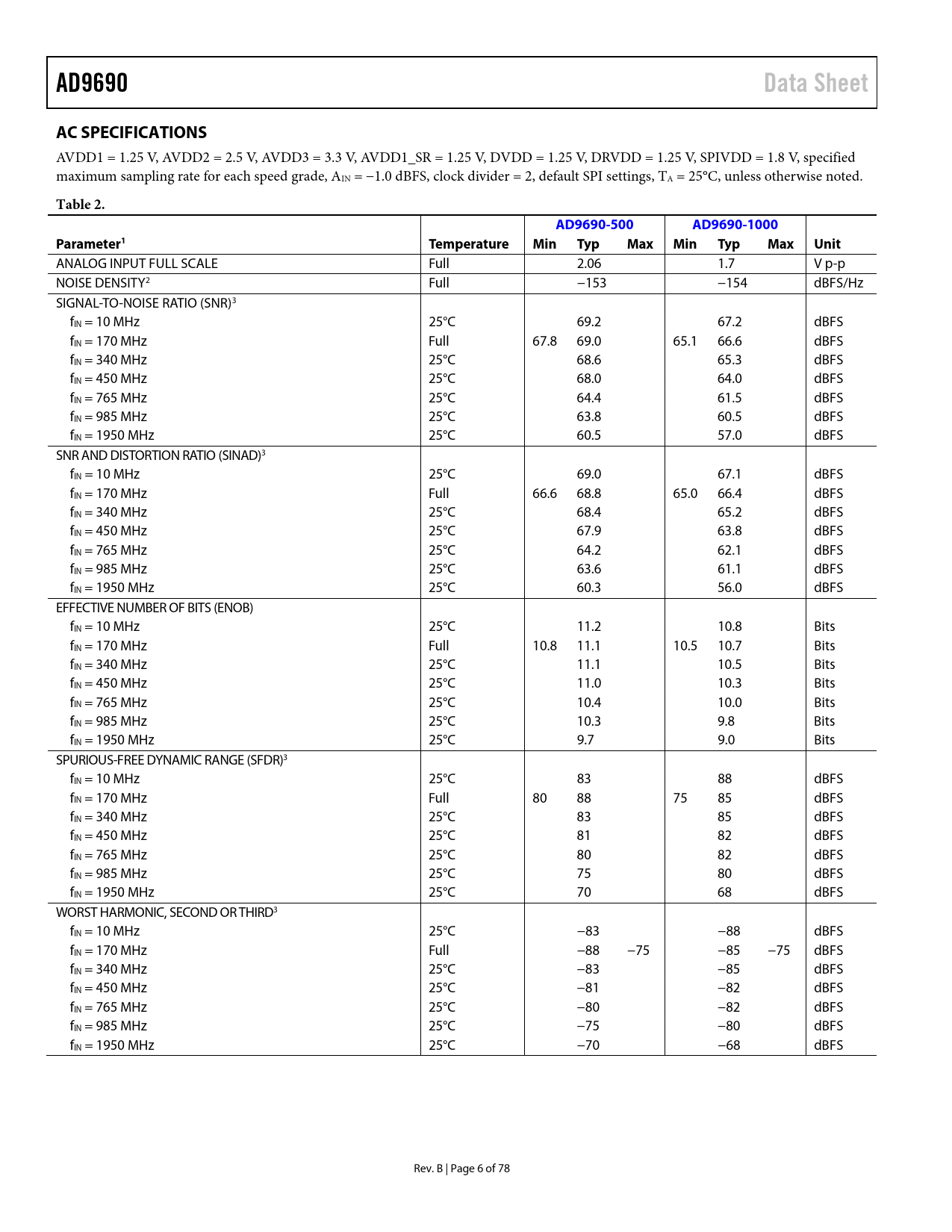 AD9690. Data Sheet. AC SPECIFICATIONS. Table 2. AD9690-500. AD9690-1000. Parameter1. Temperature. Min. Typ. Max. Unit