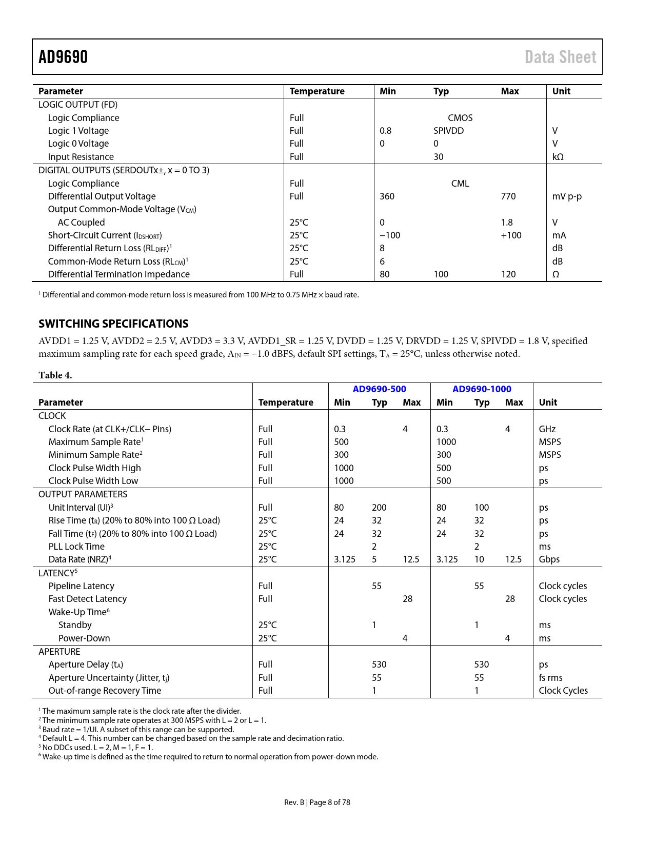Pages / Page78 / 8 — AD9690. Data Sheet. Parameter. Temperature. Min. Typ. Max. Unit. …