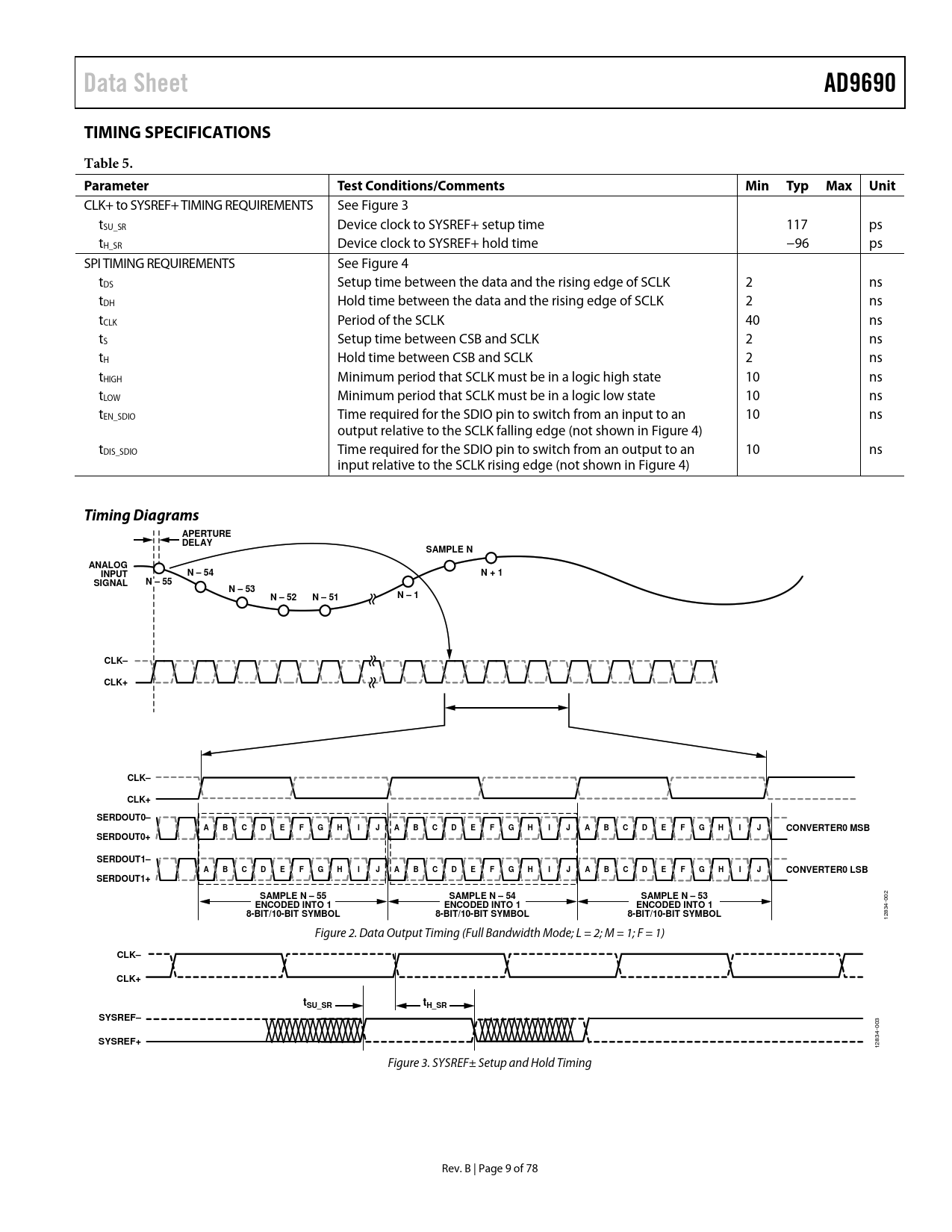 Pages / Page78 / 9 — Data Sheet. AD9690. TIMING SPECIFICATIONS. Table 5. Parameter. Test …