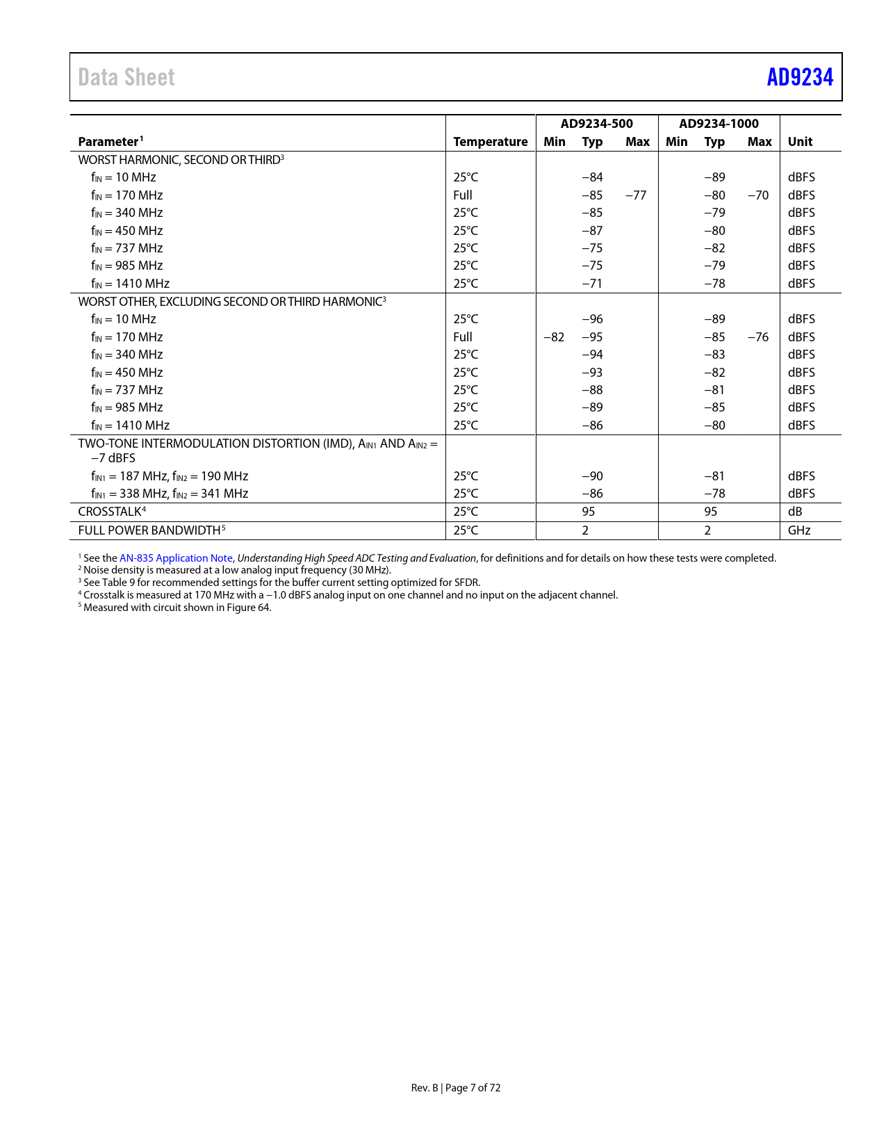 link to page 27 link to page 25 Data SheetAD9234AD9234-500AD9234-1000Parameter1Temperature Min TypMax Min TypMax Unit WORST HARMONIC, SECOND OR THIRD3 fIN = 10 MHz 25°C −84 −89 dBFS fIN = 170 MHz Full −85 −77 −80 −70 dBFS fIN = 340 MHz 25°C −85 −79 dBFS fIN = 450 MHz 25°C −87 −80 dBFS fIN = 737 MHz 25°C −75 −82 dBFS fIN = 985 MHz 25°C −75 −79 dBFS fIN = 1410 MHz 25°C −71 −78 dBFS WORST OTHER, EXCLUDING SECOND OR THIRD HARMONIC3 fIN = 10 MHz 25°C −96 −89 dBFS fIN = 170 MHz Full −82 −95 −85 −76 dBFS fIN = 340 MHz 25°C −94 −83 dBFS fIN = 450 MHz 25°C −93 −82 dBFS fIN = 737 MHz 25°C −88 −81 dBFS fIN = 985 MHz 25°C −89 −85 dBFS fIN = 1410 MHz 25°C −86 −80 dBFS TWO-TONE INTERMODULATION DISTORTION (IMD), AIN1 AND AIN2 = −7 dBFS fIN1 = 187 MHz, fIN2 = 190 MHz 25°C −90 −81 dBFS fIN1 = 338 MHz, fIN2 = 341 MHz 25°C −86 −78 dBFS CROSSTALK4 25°C 95 95 dB FULL POWER BANDWIDTH5 25°C 2 2 GHz 1 See the AN-835 Application Note, Understanding High Speed ADC Testing and Evaluation, for definitions and for details on how these tests were completed. 2 Noise density is measured at a low analog input frequency (30 MHz). 3 See Table 9 for recommended settings for the buffer current setting optimized for SFDR. 4 Crosstalk is measured at 170 MHz with a −1.0 dBFS analog input on one channel and no input on the adjacent channel. 5 Measured with circuit shown in Figure 64. Rev. B | Page 7 of 72 Document Outline FEATURES APPLICATIONS FUNCTIONAL BLOCK DIAGRAM PRODUCT HIGHLIGHTS TABLE OF CONTENTS REVISION HISTORY GENERAL DESCRIPTION SPECIFICATIONS DC SPECIFICATIONS AC SPECIFICATIONS DIGITAL SPECIFICATIONS SWITCHING SPECIFICATIONS TIMING SPECIFICATIONS Timing Diagrams ABSOLUTE MAXIMUM RATINGS THERMAL CHARACTERISTICS ESD CAUTION PIN CONFIGURATION AND FUNCTION DESCRIPTIONS TYPICAL PERFORMANCE CHARACTERISTICS AD9234-1000 AD9234-500 EQUIVALENT CIRCUITS THEORY OF OPERATION ADC ARCHITECTURE ANALOG INPUT CONSIDERATIONS Differential Input Configurations Input Common Mode Analog Input Controls and SFDR Optimization Absolute Maximum Input Swing VOLTAGE REFERENCE CLOCK INPUT CONSIDERATIONS Clock Duty Cycle Considerations Input Clock Divider Input Clock Divider ½ Period Delay Adjust Clock Fine Delay Adjust CLOCK JITTER CONSIDERATIONS POWER-DOWN/STANDBY MODE TEMPERATURE DIODE ADC OVERRANGE AND FAST DETECT ADC OVERRANGE FAST THRESHOLD DETECTION (FD_A AND FD_B) SIGNAL MONITOR SPORT Over JESD204B DIGITAL DOWNCONVERTER (DDC) DDC GENERAL DESCRIPTION HALF-BAND FILTER DDC GAIN STAGE DDC COMPLEX TO REAL CONVERSION DIGITAL OUTPUTS INTRODUCTION TO THE JESD204B INTERFACE JESD204B OVERVIEW FUNCTIONAL OVERVIEW Transport Layer Data Link Layer Physical Layer JESD204B LINK ESTABLISHMENT Code Group Synchronization (CGS) and SYNCINB± Initial Lane Alignment Sequence (ILAS) User Data and Error Detection 8B/10B Encoder PHYSICAL LAYER (DRIVER) OUTPUTS Digital Outputs, Timing, and Controls De-Emphasis Phase-Locked Loop CONFIGURING THE JESD204B LINK Example 1: Full Bandwidth Mode at 1 GSPS Example 2: Full Bandwidth Mode at 500 MSPS Example 3: ADC with DDC Option (Two ADCs Plus Two DDCs) DETERMINISTIC LATENCY SUBCLASS 0 OPERATION SUBCLASS 1 OPERATION Deterministic Latency Requirements Setting Deterministic Latency Registers MULTICHIP SYNCHRONIZATION NORMAL MODE TIMESTAMP MODE SYSREF± INPUT SYSREF± Control Features SYSREF± SETUP/HOLD WINDOW MONITOR LATENCY END TO END TOTAL LATENCY EXAMPLE LATENCY CALCULATION TEST MODES ADC TEST MODES JESD204B BLOCK TEST MODES Transport Layer Sample Test Mode Interface Test Modes Data Link Layer Test Modes SERIAL PORT INTERFACE CONFIGURATION USING THE SPI HARDWARE INTERFACE SPI ACCESSIBLE FEATURES MEMORY MAP READING THE MEMORY MAP REGISTER TABLE Open and Reserved Locations Default Values Logic Levels Channel-Specific Registers SPI Soft Reset MEMORY MAP REGISTER TABLE APPLICATIONS INFORMATION POWER SUPPLY RECOMMENDATIONS EXPOSED PAD THERMAL HEAT SLUG RECOMMENDATIONS AVDD1_SR (PIN 57) AND AGND (PIN 56 AND PIN 60) OUTLINE DIMENSIONS ORDERING GUIDE