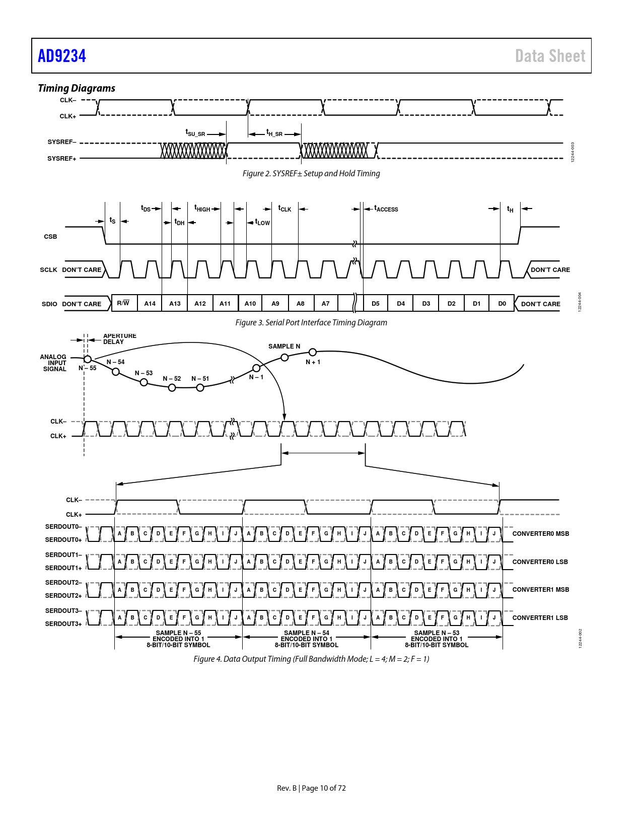 AD9234. Data Sheet. Timing Diagrams. CLK–. CLK+. tSU_SR. tH_SR. SYSREF–. SYSREF+. HIGH. CLK. tACCESS. tDH. tLOW. CSB. SCLK DON’T CARE. DON’T CARE