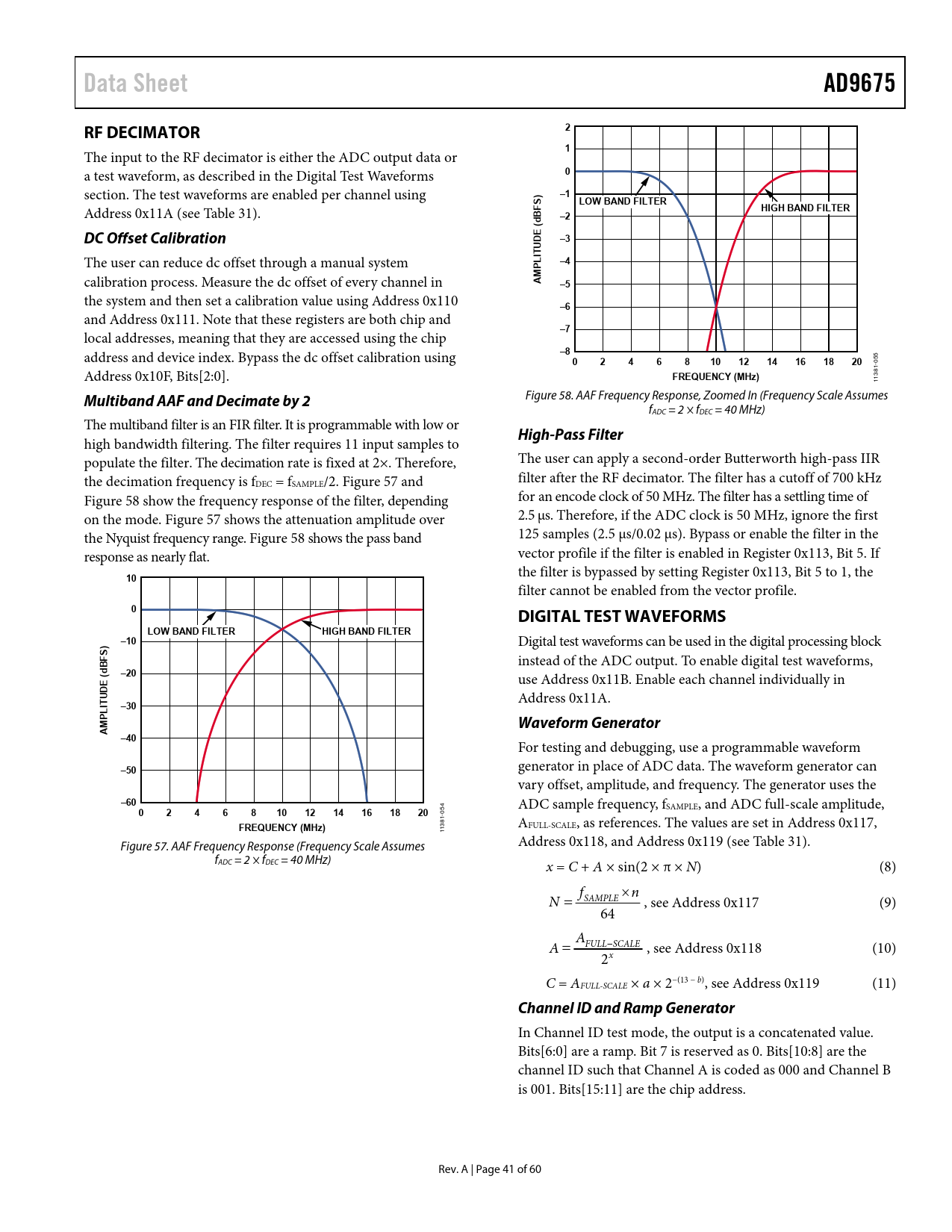 link to page 41 link to page 47 link to page 41 link to page 41 link to page 41 link to page 41 link to page 47 Data SheetAD9675RF DECIMATOR21 The input to the RF decimator is either the ADC output data or a test waveform, as described in the Digital Test Waveforms 0 section. The test waveforms are enabled per channel using )–1SLOW BAND FILTER Address 0x11A (see Table 31). HIGH BAND FILTERBF–2(d EDC Offset Calibration–3UD IT The user can reduce dc offset through a manual system L P–4 calibration process. Measure the dc offset of every channel in AM–5 the system and then set a calibration value using Address 0x110 –6 and Address 0x111. Note that these registers are both chip and –7 local addresses, meaning that they are accessed using the chip address and device index. Bypass the dc offset calibration using –8 5 02468101214161820 05 Address 0x10F, Bits[2:0]. FREQUENCY (MHz) 381- 1 1 Multiband AAF and Decimate by 2 Figure 58. AAF Frequency Response, Zoomed In (Frequency Scale Assumes fADC = 2 × fDEC = 40 MHz) The multiband filter is an FIR filter. It is programmable with low or High-Pass Filter high bandwidth filtering. The filter requires 11 input samples to populate the filter. The decimation rate is fixed at 2×. Therefore, The user can apply a second-order Butterworth high-pass IIR the decimation frequency is f filter after the RF decimator. The filter has a cutoff of 700 kHz DEC = fSAMPLE/2. Figure 57 and Figure 58 show the frequency response of the filter, depending for an encode clock of 50 MHz. The filter has a settling time of on the mode. Figure 57 shows the attenuation amplitude over 2.5 μs. Therefore, if the ADC clock is 50 MHz, ignore the first the Nyquist frequency range. Figure 58 shows the pass band 125 samples (2.5 μs/0.02 μs). Bypass or enable the filter in the response as nearly flat. vector profile if the filter is enabled in Register 0x113, Bit 5. If the filter is bypassed by setting Register 0x113, Bit 5 to 1, the 10 filter cannot be enabled from the vector profile. 0DIGITAL TEST WAVEFORMSLOW BAND FILTERHIGH BAND FILTER)–10 Digital test waveforms can be used in the digital processing block S BF instead of the ADC output. To enable digital test waveforms, (d–20E use Address 0x11B. Enable each channel individually in UD Address 0x11A. IT L–30PWaveform GeneratorAM–40 For testing and debugging, use a programmable waveform –50 generator in place of ADC data. The waveform generator can vary offset, amplitude, and frequency. The generator uses the –60 ADC sample frequency, fSAMPLE, and ADC full-scale amplitude, 02468101214161820 054 81- FREQUENCY (MHz) 13 A 1 FULL-SCALE, as references. The values are set in Address 0x117, Figure 57. AAF Frequency Response (Frequency Scale Assumes Address 0x118, and Address 0x119 (see Table 31). fADC = 2 × fDEC = 40 MHz) x = C + A × sin(2 × π × N) (8) f n N SAMPLE , see Address 0x117 (9) 64 AFULLSCALE A , see Address 0x118 (10) x 2 C = AFULL-SCALE × a × 2−(13 − b), see Address 0x119 (11) Channel ID and Ramp Generator In Channel ID test mode, the output is a concatenated value. Bits[6:0] are a ramp. Bit 7 is reserved as 0. Bits[10:8] are the channel ID such that Channel A is coded as 000 and Channel B is 001. Bits[15:11] are the chip address. Rev. A | Page 41 of 60 Document Outline Features Applications General Description Table of Contents Revision History Functional Block Diagram Specifications AC Specifications Digital Specifications Switching Specifications CLK±, TX_TRIG± Synchronization Timing Diagram CW Timing Diagram Absolute Maximum Ratings Thermal Impedance ESD Caution Pin Configuration and Function Descriptions Typical Performance Characteristics TGC Mode CW Doppler Mode Theory of Operation TGC Operation Low Noise Amplifier (LNA) Active Impedance Matching LNA Noise CLNA Connection DC Offset Correction/High-Pass Filter Variable Gain Amplifier (VGA) Gain Control VGA Noise Antialiasing Filter (AAF) AAF/VGA Test Mode ADC Clock Input Considerations Clock Duty Cycle Considerations Clock Jitter Considerations Power Dissipation and Power-Down Mode Power and Ground Connection Recommendations Advanced Power Control Digital Outputs and Timing JESD204B Transmit Top Level Description JESD204B Overview JESD204B Synchronization Details CGS Phase ILAS Phase Data Transmission Phase Link Setup Parameters Disable Lanes Converter and Lane Configuration Configure the Tail Bits and Control Bits Set Lane Identification Values Set Number of Frames per Multiframe, K Enable Scramble, SCR Set Lane Synchronization Options Check FCHK, Checksum of JESD204B Interface Parameters Set Additional Digital Output Configuration Options Reenable Lanes After Configuration Frame and Lane Alignment Monitoring and Correction Digital Outputs and Timing Preemphasis Digital Output Test Patterns SDIO Pin SCLK Pin CSB Pin RBIAS Pin VREF Pin GPOx Pins ADDRx Pins TX_TRIG± Pins Analog Test Tone Generation CW Doppler Operation Quadrature Generation I/Q Demodulator and Phase Shifter Digital RF Decimator Vector Profile RF Decimator DC Offset Calibration Multiband AAF and Decimate by 2 High-Pass Filter Digital Test Waveforms Waveform Generator Channel ID and Ramp Generator Digital Block Power Saving Scheme Serial Port Interface (SPI) Hardware Interface Memory Map Reading the Memory Map Table Reserved Locations Default Values Logic Levels Recommended Start-Up Sequence Memory Map Register Table Memory Map Register Descriptions Transfer (Register 0x0FF) Profile Index and Software TX_TRIG (Register 0x10C) Outline Dimensions Ordering Guide