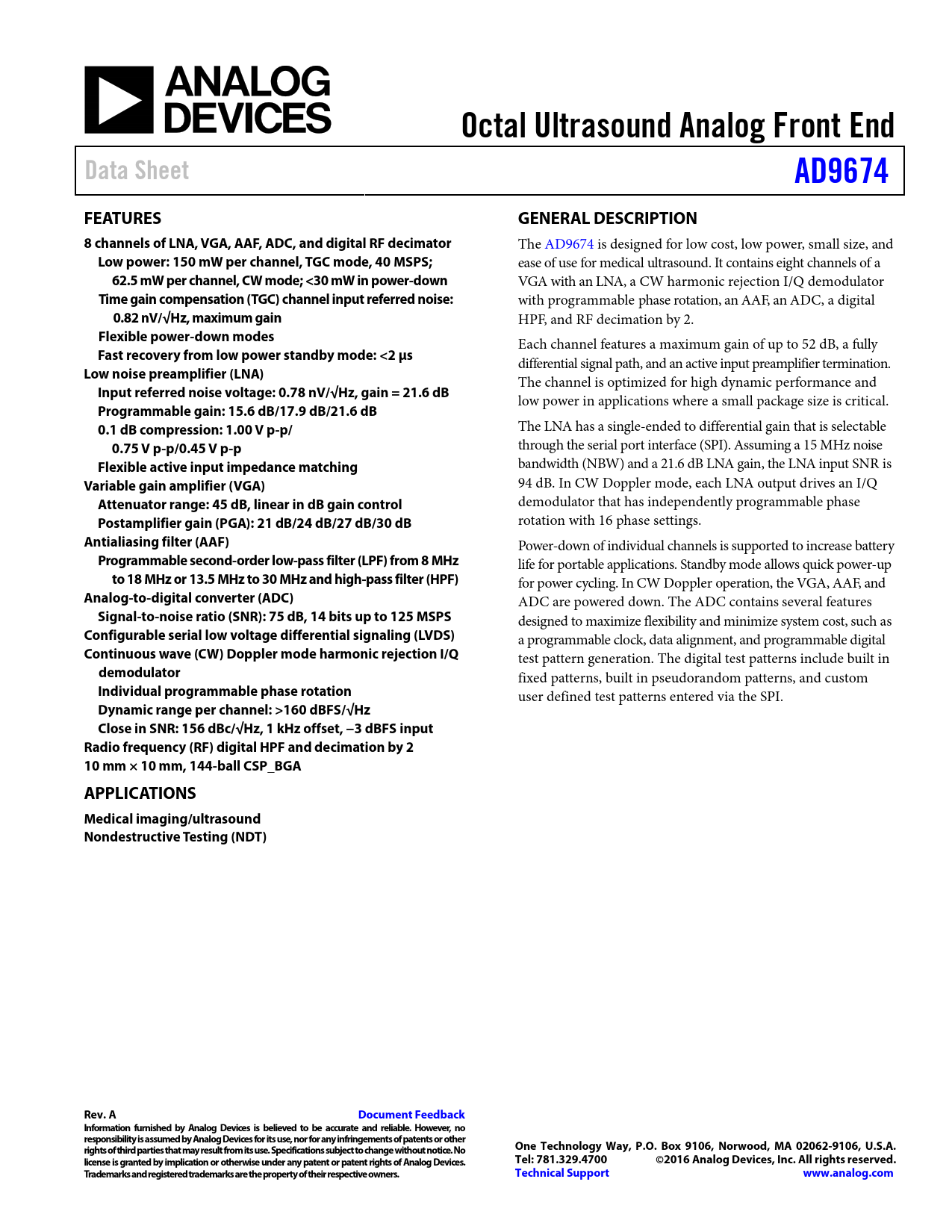 Octal Ultrasound Analog Front End. Data Sheet. AD9674. FEATURES. GENERAL DESCRIPTION