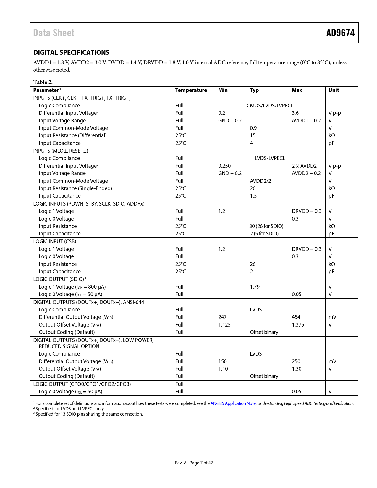 Pages / Page47 / 7 — Data Sheet. AD9674. DIGITAL SPECIFICATIONS. Table 2. Parameter1. …