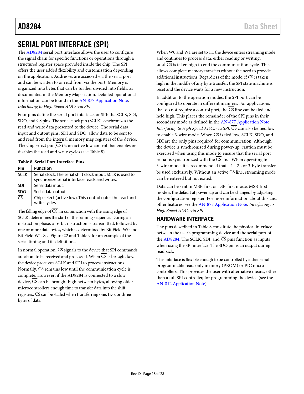 link to page 20 link to page 18 link to page 19 link to page 19 link to page 18 AD8284Data SheetSERIAL PORT INTERFACE (SPI) The AD8284 serial port interface allows the user to configure When W0 and W1 are set to 11, the device enters streaming mode the signal chain for specific functions or operations through a and continues to process data, either reading or writing, structured register space provided inside the chip. The SPI until CS is taken high to end the communication cycle. This offers the user added flexibility and customization depending allows complete memory transfers without the need to provide on the application. Addresses are accessed via the serial port additional instructions. Regardless of the mode, if CS is taken and can be written to or read from via the port. Memory is high in the middle of any byte transfer, the SPI state machine is organized into bytes that can be further divided into fields, as reset and the device waits for a new instruction. documented in the Memory Map section. Detailed operational In addition to the operation modes, the SPI port can be information can be found in the AN-877 Application Note, configured to operate in different manners. For applications Interfacing to High Speed ADCs via SPI. that do not require a control port, the CS line can be tied and Four pins define the serial port interface, or SPI: the SCLK, SDI, held high. This places the remainder of the SPI pins in their SDO, and CS pins. The serial clock pin (SCLK) synchronizes the secondary mode as defined in the AN-877 Application Note, read and write data presented to the device. The serial data Interfacing to High Speed ADCs via SPI. CS can also be tied low input and output pins, SDI and SDO, allow data to be sent to to enable 3-wire mode. When CS is tied low, SCLK, SDO, and and read from the internal memory map registers of the device. SDI are the only pins required for communication. Although The chip select pin (CS) is an active low control that enables or the device is synchronized during power-up, caution must be disables the read and write cycles (see Table 8). exercised when using this mode to ensure that the serial port Table 8. Serial Port Interface Pins remains synchronized with the CS line. When operating in PinFunction 3-wire mode, it is recommended that a 1-, 2-, or 3-byte transfer SCLK Serial clock. The serial shift clock input. SCLK is used to be used exclusively. Without an active CS line, streaming mode synchronize serial interface reads and writes. can be entered but not exited. SDI Serial data input. Data can be sent in MSB-first or LSB-first mode. MSB-first SDO Serial data output. mode is the default at power-up and can be changed by adjusting CS Chip select (active low). This control gates the read and the configuration register. For more information about this and write cycles. other features, see the AN-877 Application Note, Interfacing to The fal ing edge of CS, in conjunction with the rising edge of High Speed ADCs via SPI. SCLK, determines the start of the framing sequence. During an HARDWARE INTERFACE instruction phase, a 16-bit instruction is transmitted, followed by one or more data bytes, which is determined by Bit Field W0 and The pins described in Table 8 constitute the physical interface Bit Field W1. See Figure 22 and Table 9 for an example of the between the user’s programming device and the serial port of serial timing and its definitions. the AD8284. The SCLK, SDI, and CS pins function as inputs when using the SPI interface. The SDO pin is an output during In normal operation, CS signals to the device that SPI commands readback. are about to be received and processed. When CS is brought low, This interface is flexible enough to be controlled by either serial- the device processes SCLK and SDI to process instructions. programmable read-only memory (PROM) or PIC micro- Normally, CS remains low until the communication cycle is control ers. This provides the user with alternative means, other complete. However, if the AD8284 is connected to a slow than a full SPI control er, for programming the device (see the device, CS can be brought high between bytes, al owing older AN-812 Application Note). microcontrollers enough time to transfer data into the shift registers. CS can be stal ed when transferring one, two, or three bytes of data. Rev. D | Page 18 of 28 Document Outline Features Applications Functional Block Diagram General Description Table of Contents Revision History Specifications AC Specifications Digital Specifications Switching Specifications Timing and Switching Diagram Absolute Maximum Ratings ESD Caution Pin Configuration and Function Descriptions Typical Performance Characteristics Theory of Operation Radar Receive Path AFE Channel Overview Multiplexer Low Noise Amplifier Recommendation Antialiasing Filter Saturation Flag ADC AUX Channel Clock Input Considerations Clock Duty Cycle Considerations Clock Jitter Considerations SDI and SDO Pins SCLK Pin CS Pin RBIAS Pin Voltage Reference Power and Ground Recommendations Exposed Pad Thermal Heat Slug Recommendations Serial Port Interface (SPI) Hardware Interface Memory Map Reading the Memory Map Table Caution Logic Levels Reserved Locations Default Values Application Circuits Packaging and Ordering Information Outline Dimensions Ordering Guide Automotive Products
