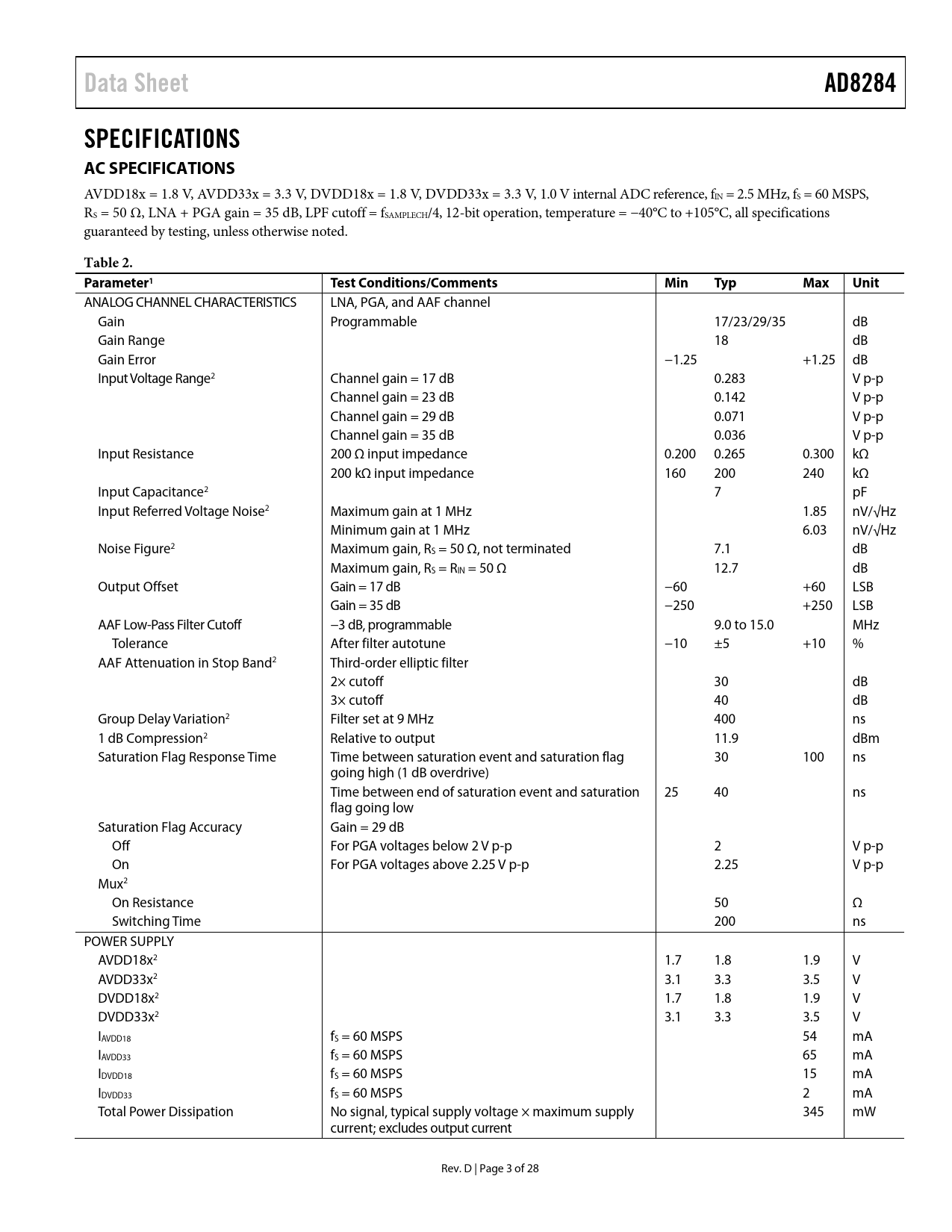 Pages / Page28 / 3 — Data Sheet. AD8284. SPECIFICATIONS AC SPECIFICATIONS. Table 2. …