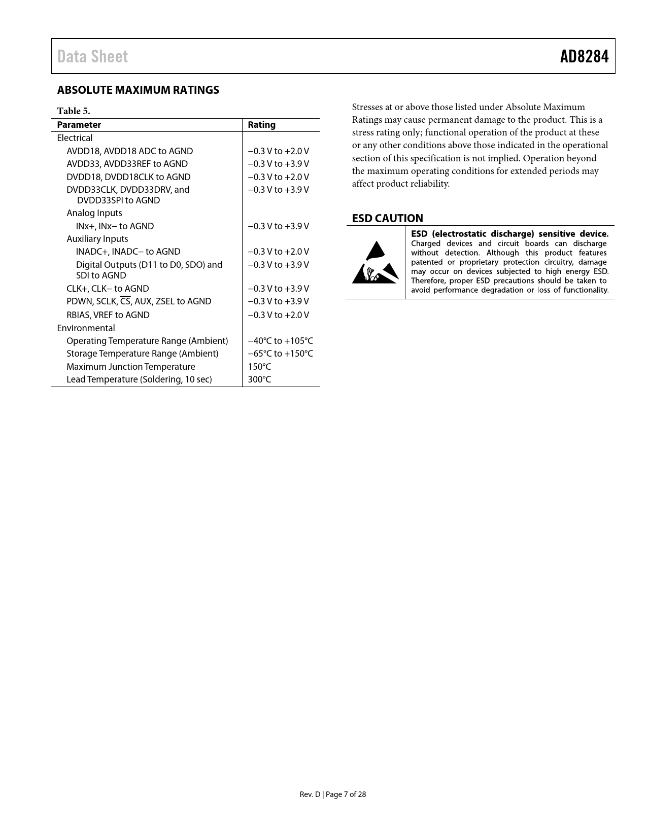Data Sheet AD8284 ABSOLUTE MAXIMUM RATINGS Table 5 Parameter Rating ESD CAUTION