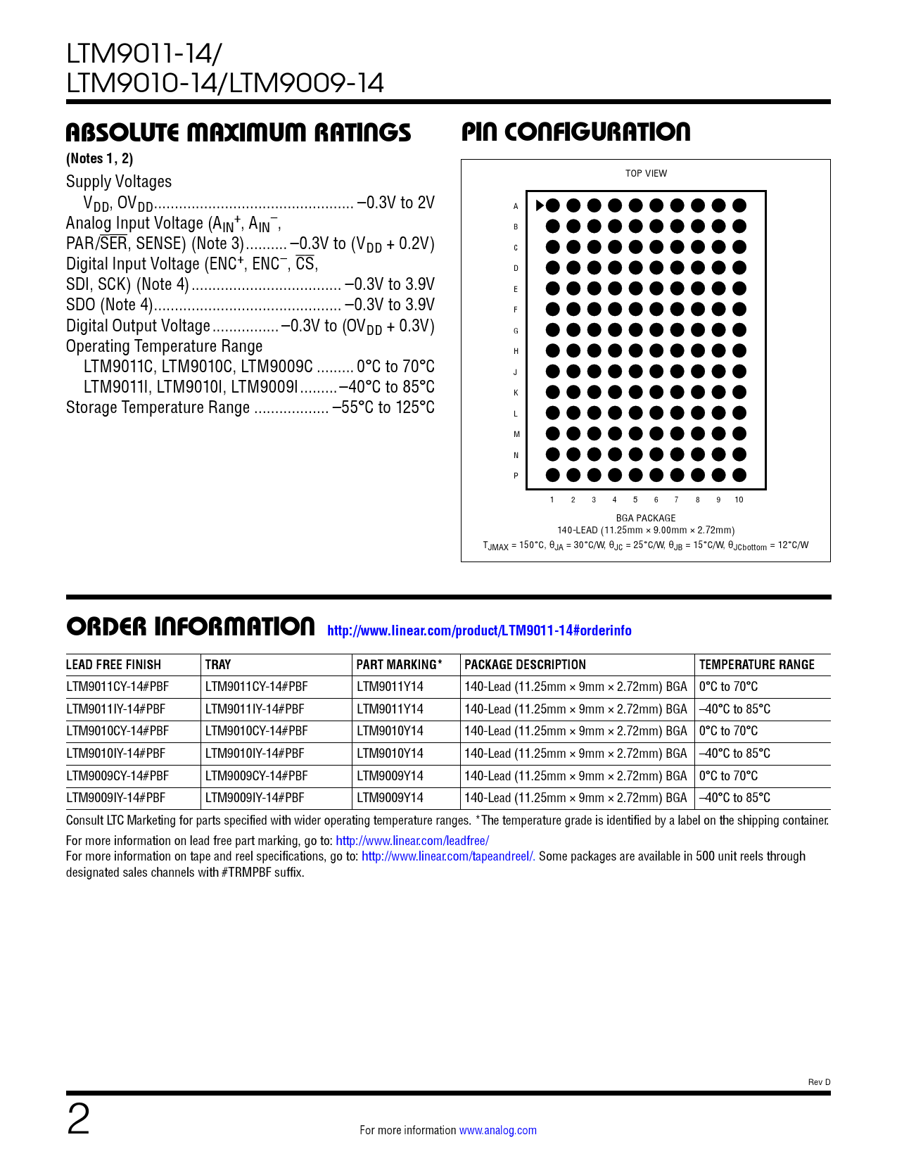 LTM9011-14/ LTM9010-14/LTM9009-14 ABSOLUTE MAXIMUM RATINGS PIN CONFIGURATION (Notes 1, 2) Supply Voltages TOP VIEW VDD, OVDD .. –0.3V to 2V A Analog Input Voltage (A + – IN , AIN , B PAR/SER, SENSE) (Note 3) .. –0.3V to (VDD + 0.2V) C Digital Input Voltage (ENC+, ENC–, CS, D SDI, SCK) (Note 4) .. –0.3V to 3.9V E SDO (Note 4) ... –0.3V to 3.9V F Digital Output Voltage .. –0.3V to (OVDD + 0.3V) G Operating Temperature Range H LTM9011C, LTM9010C, LTM9009C ... 0°C to 70°C J LTM9011I, LTM9010I, LTM9009I ...–40°C to 85°C K Storage Temperature Range .. –55°C to 125°C L M N P 1 2 3 4 5 6 7 8 9 10 BGA PACKAGE 140-LEAD (11.25mm × 9.00mm × 2.72mm) TJMAX = 150°C, θJA = 30°C/W, θJC = 25°C/W, θJB = 15°C/W, θJCbottom = 12°C/W ORDER INFORMATION http://www.linear.com/product/LTM9011-14#orderinfoLEAD FREE FINISHTRAYPART MARKING*PACKAGE DESCRIPTIONTEMPERATURE RANGE LTM9011CY-14#PBF LTM9011CY-14#PBF LTM9011Y14 140-Lead (11.25mm × 9mm × 2.72mm) BGA 0°C to 70°C LTM9011IY-14#PBF LTM9011IY-14#PBF LTM9011Y14 140-Lead (11.25mm × 9mm × 2.72mm) BGA –40°C to 85°C LTM9010CY-14#PBF LTM9010CY-14#PBF LTM9010Y14 140-Lead (11.25mm × 9mm × 2.72mm) BGA 0°C to 70°C LTM9010IY-14#PBF LTM9010IY-14#PBF LTM9010Y14 140-Lead (11.25mm × 9mm × 2.72mm) BGA –40°C to 85°C LTM9009CY-14#PBF LTM9009CY-14#PBF LTM9009Y14 140-Lead (11.25mm × 9mm × 2.72mm) BGA 0°C to 70°C LTM9009IY-14#PBF LTM9009IY-14#PBF LTM9009Y14 140-Lead (11.25mm × 9mm × 2.72mm) BGA –40°C to 85°C Consult LTC Marketing for parts specified with wider operating temperature ranges. *The temperature grade is identified by a label on the shipping container. For more information on lead free part marking, go to: http://www.linear.com/leadfree/ For more information on tape and reel specifications, go to: http://www.linear.com/tapeandreel/. Some packages are available in 500 unit reels through designated sales channels with #TRMPBF suffix. Rev D 2 For more information www.analog.com Document Outline Features Applications Description Typical Application Absolute Maximum Ratings Pin Configuration Order Information Converter Characteristics Analog Input Dynamic Accuracy Internal Reference Characteristics Digital Inputs And Outputs Power Requirements Timing Characteristics Timing Diagrams Typical Performance Characteristics Pin Functions Pin Configuration Table Functional Block Diagram Applications Information Typical Applications Package Description Revision History Typical Application Related Parts