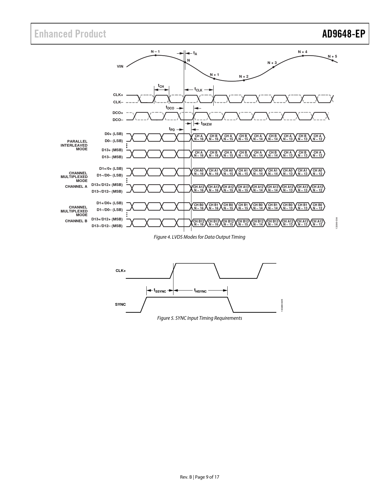 Enhanced Product. AD9648-EP. N – 1. N + 4. N + 5. N + 3. VIN. N + 1. N + 2. tCH. tCLK. CLK+. CLK–. tDCO. DCO+. DCO–. tSKEW. tPD. D0+ (LSB). CH A. CH B. N – 16