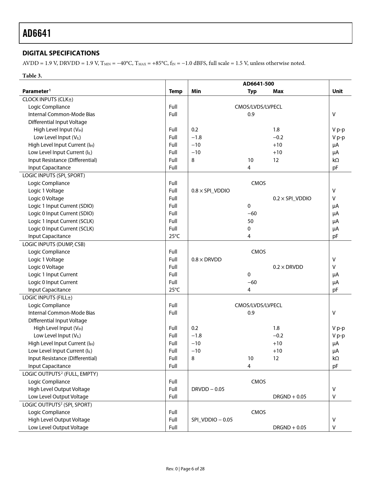 AD6641. DIGITAL SPECIFICATIONS. Table 3. AD6641-500. Parameter. Temp. Min. Typ. Max. Unit