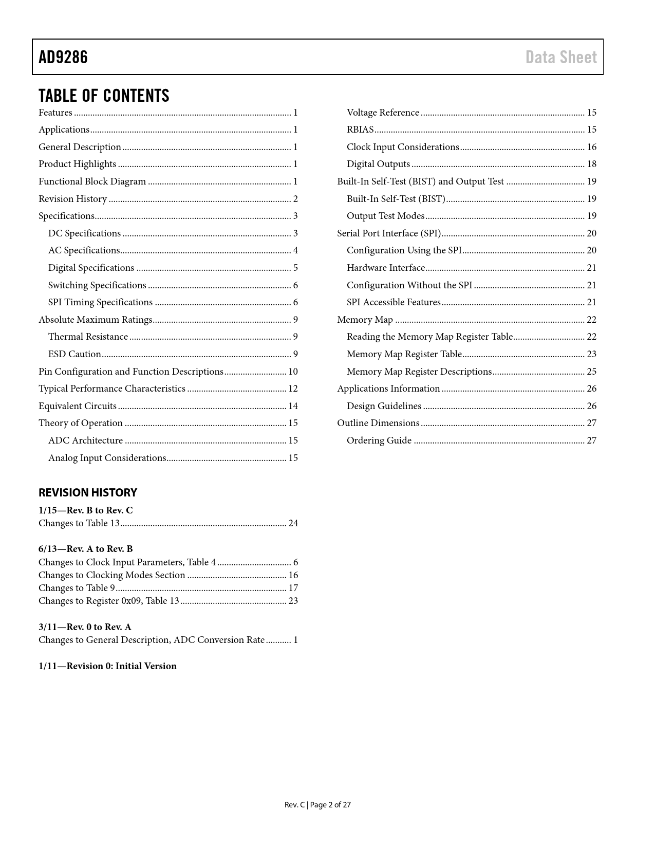 Pages / Page27 / 2 — AD9286. Data Sheet. TABLE OF CONTENTS. REVISION HISTORY 1/15—Rev. B to …