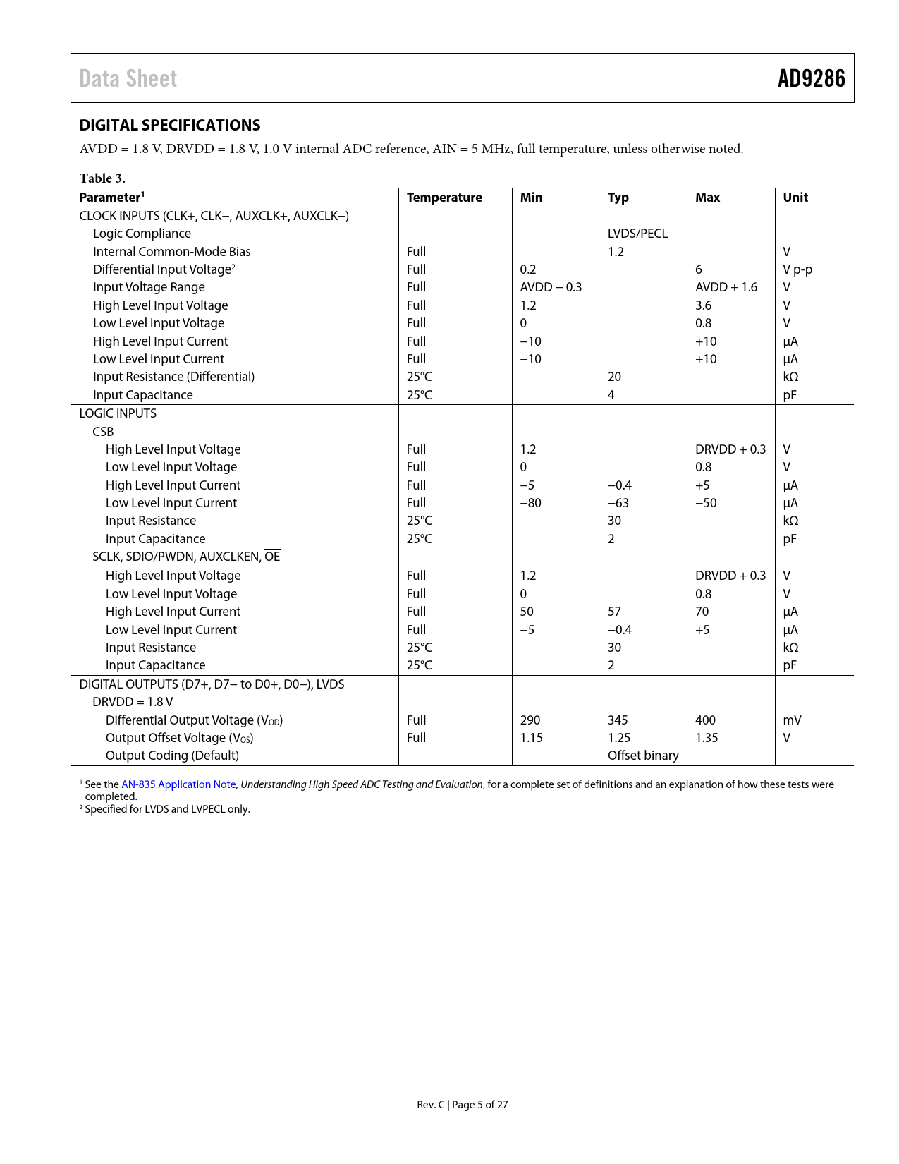 Pages / Page27 / 5 — Data Sheet. AD9286. DIGITAL SPECIFICATIONS. Table 3. Parameter1. …