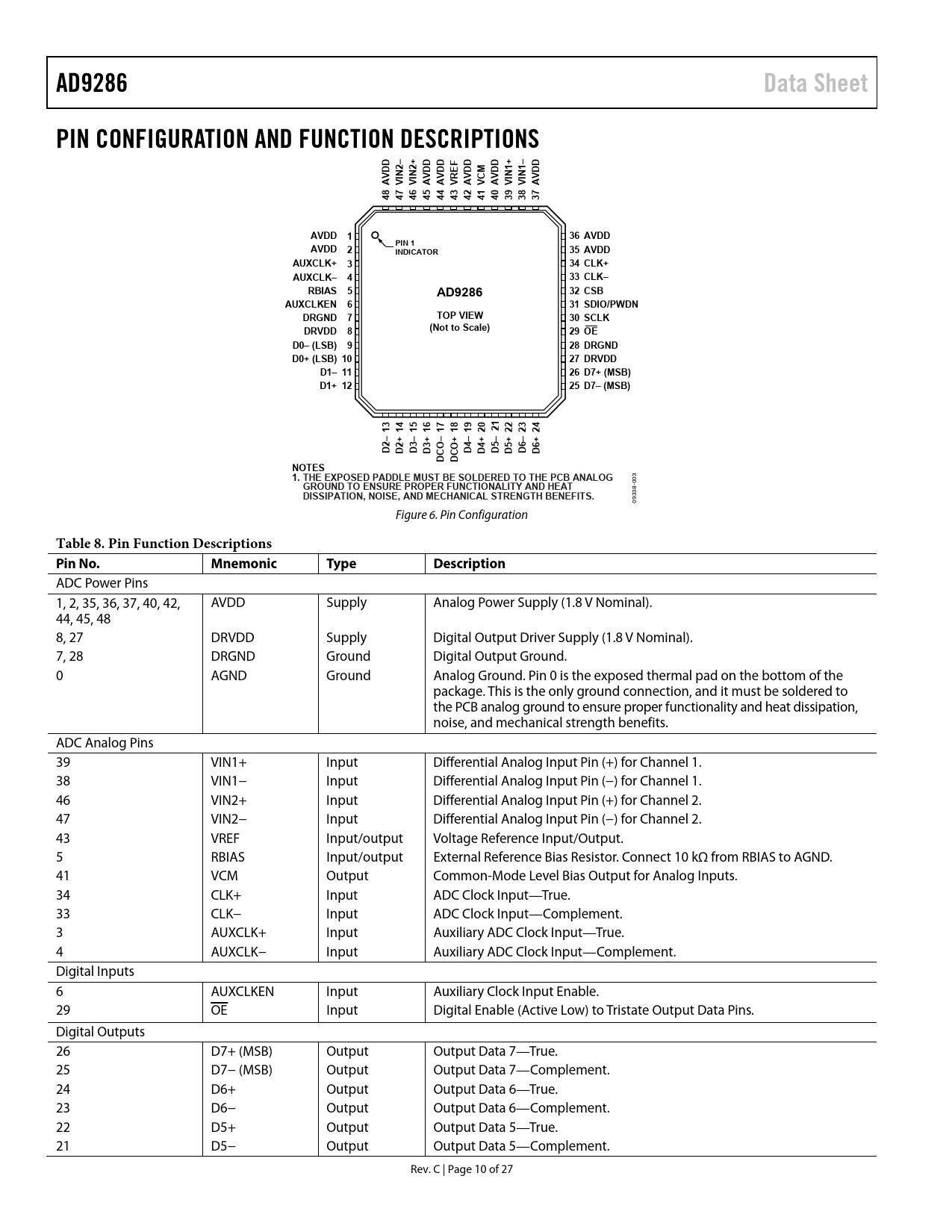 AD9286Data SheetPIN CONFIGURATION AND FUNCTION DESCRIPTIONSDD2–2+1+1–NNDDDDEFDDMDDNNDDAVVIVIAVAVVRAVVCAVVIVIAV484746454443424140393837AVDD 136 AVDDPIN 1AVDD 2INDICATOR35 AVDDAUXCLK+ 334 CLK+AUXCLK– 433 CLK–RBIAS 532 CSBAD9286AUXCLKEN 631 SDIO/PWDNDRGND 7TOP VIEW30 SCLKDRVDD 8(Not to Scale)29 OED0– (LSB) 928 DRGNDD0+ (LSB) 1027 DRVDDD1– 1126 D7+ (MSB)D1+ 1225 D7– (MSB)131415161718192021222324–+–+–+–+–+–+D2D2D3D3OD4D4D5D5D6D6DCDCONOTES1. THE EXPOSED PADDLE MUST BE SOLDERED TO THE PCB ANALOG 03 0 GROUND TO ENSURE PROPER FUNCTIONALITY AND HEAT 38- DISSIPATION, NOISE, AND MECHANICAL STRENGTH BENEFITS. 093 Figure 6. Pin Configuration Table 8. Pin Function Descriptions Pin No.MnemonicTypeDescription ADC Power Pins 1, 2, 35, 36, 37, 40, 42, AVDD Supply Analog Power Supply (1.8 V Nominal). 44, 45, 48 8, 27 DRVDD Supply Digital Output Driver Supply (1.8 V Nominal). 7, 28 DRGND Ground Digital Output Ground. 0 AGND Ground Analog Ground. Pin 0 is the exposed thermal pad on the bottom of the package. This is the only ground connection, and it must be soldered to the PCB analog ground to ensure proper functionality and heat dissipation, noise, and mechanical strength benefits. ADC Analog Pins 39 VIN1+ Input Differential Analog Input Pin (+) for Channel 1. 38 VIN1− Input Differential Analog Input Pin (−) for Channel 1. 46 VIN2+ Input Differential Analog Input Pin (+) for Channel 2. 47 VIN2− Input Differential Analog Input Pin (−) for Channel 2. 43 VREF Input/output Voltage Reference Input/Output. 5 RBIAS Input/output External Reference Bias Resistor. Connect 10 kΩ from RBIAS to AGND. 41 VCM Output Common-Mode Level Bias Output for Analog Inputs. 34 CLK+ Input ADC Clock Input—True. 33 CLK− Input ADC Clock Input—Complement. 3 AUXCLK+ Input Auxiliary ADC Clock Input—True. 4 AUXCLK− Input Auxiliary ADC Clock Input—Complement. Digital Inputs 6 AUXCLKEN Input Auxiliary Clock Input Enable. 29 OE Input Digital Enable (Active Low) to Tristate Output Data Pins. Digital Outputs 26 D7+ (MSB) Output Output Data 7—True. 25 D7− (MSB) Output Output Data 7—Complement. 24 D6+ Output Output Data 6—True. 23 D6− Output Output Data 6—Complement. 22 D5+ Output Output Data 5—True. 21 D5− Output Output Data 5—Complement. Rev. C | Page 10 of 27 Document Outline FEATURES APPLICATIONS GENERAL DESCRIPTION PRODUCT HIGHLIGHTS FUNCTIONAL BLOCK DIAGRAM TABLE OF CONTENTS REVISION HISTORY SPECIFICATIONS DC SPECIFICATIONS AC SPECIFICATIONS DIGITAL SPECIFICATIONS SWITCHING SPECIFICATIONS SPI TIMING SPECIFICATIONS Timing Diagrams ABSOLUTE MAXIMUM RATINGS THERMAL RESISTANCE ESD CAUTION PIN CONFIGURATION AND FUNCTION DESCRIPTIONS TYPICAL PERFORMANCE CHARACTERISTICS EQUIVALENT CIRCUITS THEORY OF OPERATION ADC ARCHITECTURE ANALOG INPUT CONSIDERATIONS Differential Input Configurations VOLTAGE REFERENCE RBIAS CLOCK INPUT CONSIDERATIONS Clock Input Options Clocking Modes Interleave Performance DIGITAL OUTPUTS Digital Output Enable Function () BUILT-IN SELF-TEST (BIST) AND OUTPUT TEST BUILT-IN SELF-TEST (BIST) OUTPUT TEST MODES SERIAL PORT INTERFACE (SPI) CONFIGURATION USING THE SPI HARDWARE INTERFACE CONFIGURATION WITHOUT THE SPI SPI ACCESSIBLE FEATURES MEMORY MAP READING THE MEMORY MAP REGISTER TABLE Open Locations Default Values Logic Levels Transfer Register Map Channel-Specific Registers MEMORY MAP REGISTER TABLE MEMORY MAP REGISTER DESCRIPTIONS Voltage Reference (Register 0x18) Bits[7:5]—Reserved Bits[4:0]—Voltage Reference APPLICATIONS INFORMATION DESIGN GUIDELINES Power and Ground Recommendations Exposed Paddle Thermal Heat Sink Recommendations VCM RBIAS Reference Decoupling SPI Port OUTLINE DIMENSIONS ORDERING GUIDE
