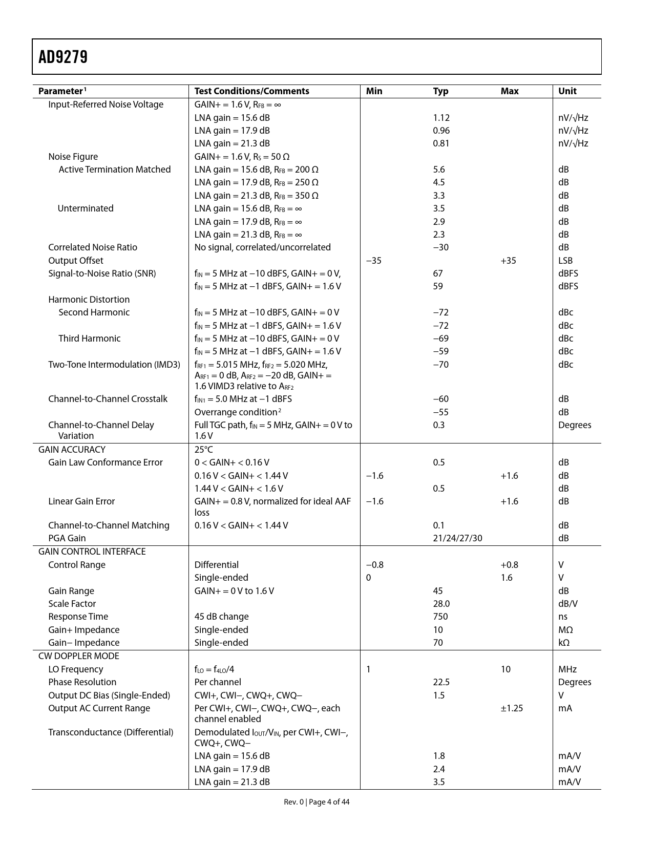 link to page 5 link to page 5 AD9279Parameter1 TestConditions/CommentsMinTypMaxUnit Input-Referred Noise Voltage GAIN+ = 1.6 V, RFB = ∞ LNA gain = 15.6 dB 1.12 nV/√Hz LNA gain = 17.9 dB 0.96 nV/√Hz LNA gain = 21.3 dB 0.81 nV/√Hz Noise Figure GAIN+ = 1.6 V, RS = 50 Ω Active Termination Matched LNA gain = 15.6 dB, RFB = 200 Ω 5.6 dB LNA gain = 17.9 dB, RFB = 250 Ω 4.5 dB LNA gain = 21.3 dB, RFB = 350 Ω 3.3 dB Unterminated LNA gain = 15.6 dB, RFB = ∞ 3.5 dB LNA gain = 17.9 dB, RFB = ∞ 2.9 dB LNA gain = 21.3 dB, RFB = ∞ 2.3 dB Correlated Noise Ratio No signal, correlated/uncorrelated −30 dB Output Offset −35 +35 LSB Signal-to-Noise Ratio (SNR) fIN = 5 MHz at −10 dBFS, GAIN+ = 0 V, 67 dBFS fIN = 5 MHz at −1 dBFS, GAIN+ = 1.6 V 59 dBFS Harmonic Distortion Second Harmonic fIN = 5 MHz at −10 dBFS, GAIN+ = 0 V −72 dBc fIN = 5 MHz at −1 dBFS, GAIN+ = 1.6 V −72 dBc Third Harmonic fIN = 5 MHz at −10 dBFS, GAIN+ = 0 V −69 dBc fIN = 5 MHz at −1 dBFS, GAIN+ = 1.6 V −59 dBc Two-Tone Intermodulation (IMD3) fRF1 = 5.015 MHz, fRF2 = 5.020 MHz, −70 dBc ARF1 = 0 dB, ARF2 = −20 dB, GAIN+ = 1.6 VIMD3 relative to ARF2 Channel-to-Channel Crosstalk fIN1 = 5.0 MHz at −1 dBFS −60 dB Overrange condition2 −55 dB Channel-to-Channel Delay Full TGC path, fIN = 5 MHz, GAIN+ = 0 V to 0.3 Degrees Variation 1.6 V GAIN ACCURACY 25°C Gain Law Conformance Error 0 < GAIN+ < 0.16 V 0.5 dB 0.16 V < GAIN+ < 1.44 V −1.6 +1.6 dB 1.44 V < GAIN+ < 1.6 V 0.5 dB Linear Gain Error GAIN+ = 0.8 V, normalized for ideal AAF −1.6 +1.6 dB loss Channel-to-Channel Matching 0.16 V < GAIN+ < 1.44 V 0.1 dB PGA Gain 21/24/27/30 dB GAIN CONTROL INTERFACE Control Range Differential −0.8 +0.8 V Single-ended 0 1.6 V Gain Range GAIN+ = 0 V to 1.6 V 45 dB Scale Factor 28.0 dB/V Response Time 45 dB change 750 ns Gain+ Impedance Single-ended 10 MΩ Gain− Impedance Single-ended 70 kΩ CW DOPPLER MODE LO Frequency fLO = f4LO/4 1 10 MHz Phase Resolution Per channel 22.5 Degrees Output DC Bias (Single-Ended) CWI+, CWI−, CWQ+, CWQ− 1.5 V Output AC Current Range Per CWI+, CWI−, CWQ+, CWQ−, each ±1.25 mA channel enabled Transconductance (Differential) Demodulated IOUT/VIN, per CWI+, CWI−, CWQ+, CWQ− LNA gain = 15.6 dB 1.8 mA/V LNA gain = 17.9 dB 2.4 mA/V LNA gain = 21.3 dB 3.5 mA/V Rev. 0 | Page 4 of 44 Document Outline FEATURES GENERAL DESCRIPTION FUNCTIONAL BLOCK DIAGRAM TABLE OF CONTENTS REVISION HISTORY SPECIFICATIONS AC SPECIFICATIONS DIGITAL SPECIFICATIONS SWITCHING SPECIFICATIONS ADC TIMING DIAGRAMS ABSOLUTE MAXIMUM RATINGS THERMAL IMPEDANCE ESD CAUTION PIN CONFIGURATION AND FUNCTION DESCRIPTIONS TYPICAL PERFORMANCE CHARACTERISTICS TGC MODE CW DOPPLER MODE EQUIVALENT CIRCUITS ULTRASOUND THEORY OF OPERATION CHANNEL OVERVIEW TGC OPERATION Low Noise Amplifier (LNA) Active Impedance Matching LNA Noise Input Overdrive Variable Gain Amplifier (VGA) Gain Control VGA Noise Antialiasing Filter (AAF) ADC Clock Input Considerations Clock Duty Cycle Considerations Clock Jitter Considerations Power Dissipation and Power-Down Mode Power and Ground Recommendations Digital Outputs and Timing SDIO Pin SCLK Pin CSB Pin RBIAS Pin Voltage Reference CW DOPPLER OPERATION Quadrature Generation I/Q Demodulator and Phase Shifter Dynamic Range and Noise Phase Compensation and Analog Beamforming CW Application Information SERIAL PORT INTERFACE (SPI) HARDWARE INTERFACE MEMORY MAP READING THE MEMORY MAP TABLE RESERVED LOCATIONS DEFAULT VALUES LOGIC LEVELS OUTLINE DIMENSIONS ORDERING GUIDE