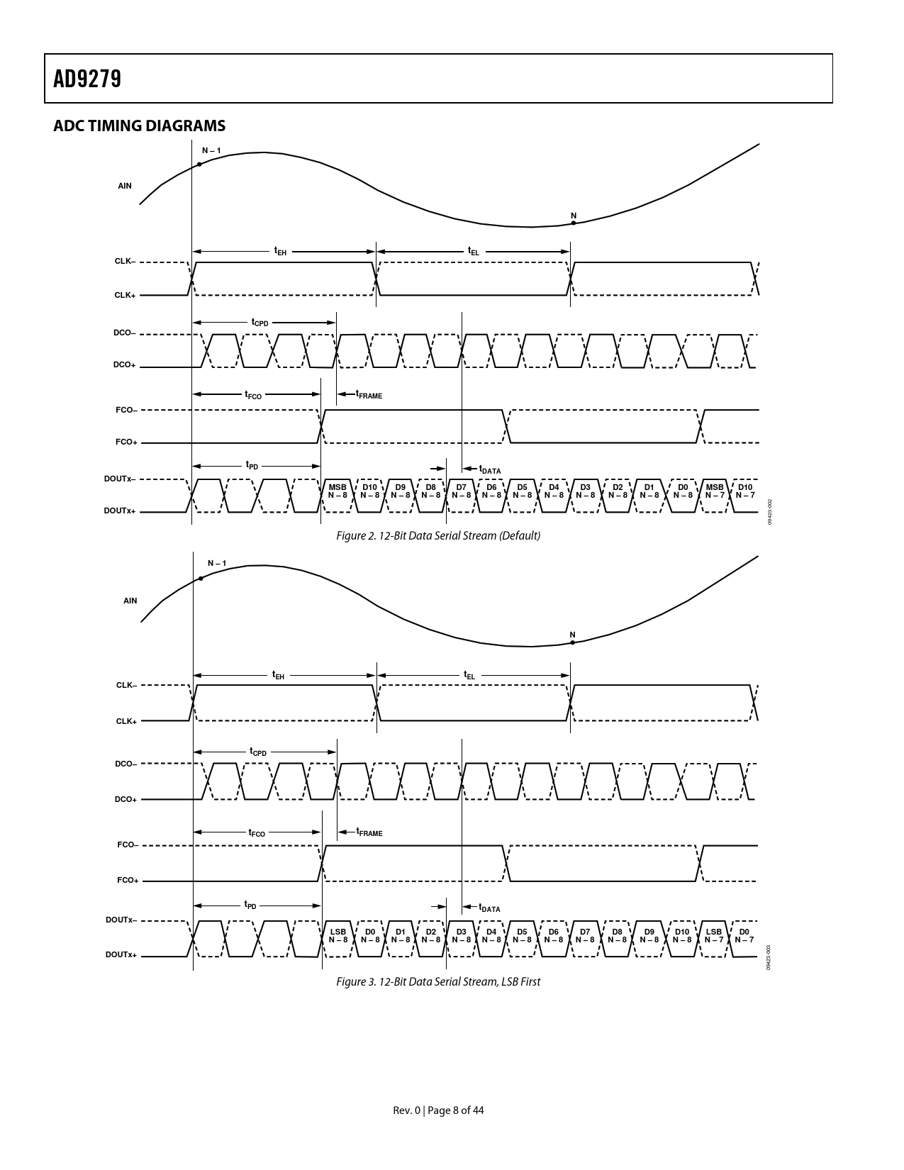 AD9279. ADC TIMING DIAGRAMS. N – 1. AIN. tEH. tEL. CLK–. CLK+. tCPD. DCO–. DCO+. FCO. FRAME. FCO–. FCO+. tPD. tDATA. DOUTx–. MSB. D10. N – 8. N – 7. DOUTx+. LSB